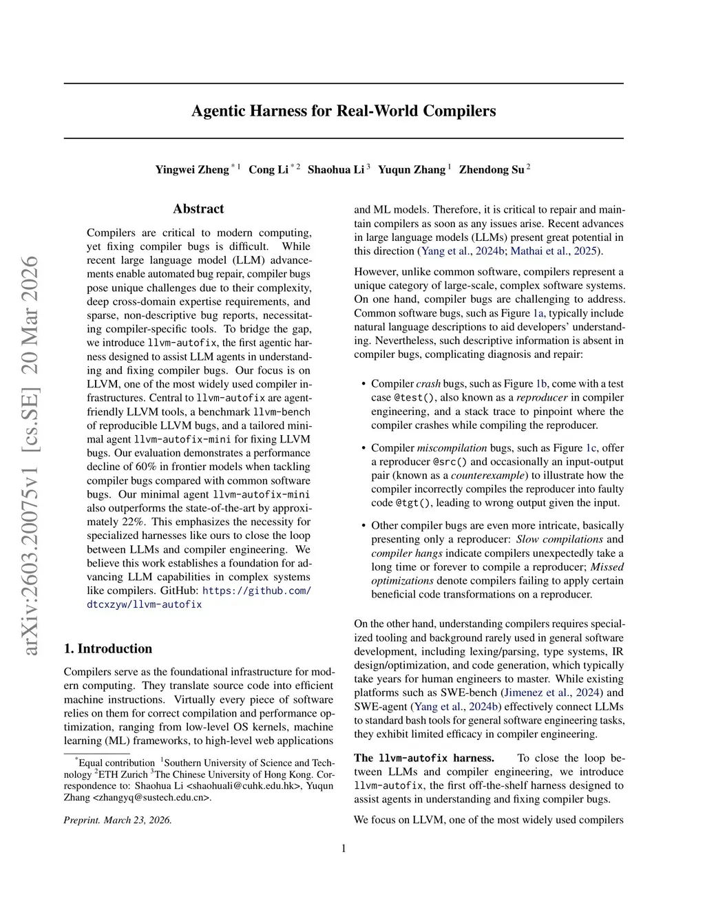 Compilers are critical to modern computing, yet fixing compiler bugs is difficult. While recent large language model (LLM) advancements enable automated bug repair, compiler bugs pose unique challenges due to their complexity, deep cross-domain expertise requirements, and sparse, non-descriptive bug reports, necessitating compiler-specific tools. To bridge the gap, we introduce llvm-autofix, the first agentic harness designed to assist LLM agents in understanding and fixing compiler bugs. Our focus is on LLVM, one of the most widely used compiler infrastructures. Central to llvm-autofix are agent-friendly LLVM tools, a benchmark llvm-bench of reproducible LLVM bugs, and a tailored minimal agent llvm-autofix-mini for fixing LLVM bugs. Our evaluation demonstrates a performance decline of 60% in frontier models when tackling compiler bugs compared with common software bugs. Our minimal agent llvm-autofix-mini also outperforms the state-of-the-art by approximately 22%. This emphasizes the necessity for specialized harnesses like ours to close the loop between LLMs and compiler engineering. We believe this work establishes a foundation for advancing LLM capabilities in complex systems like compilers. GitHub:this https URL