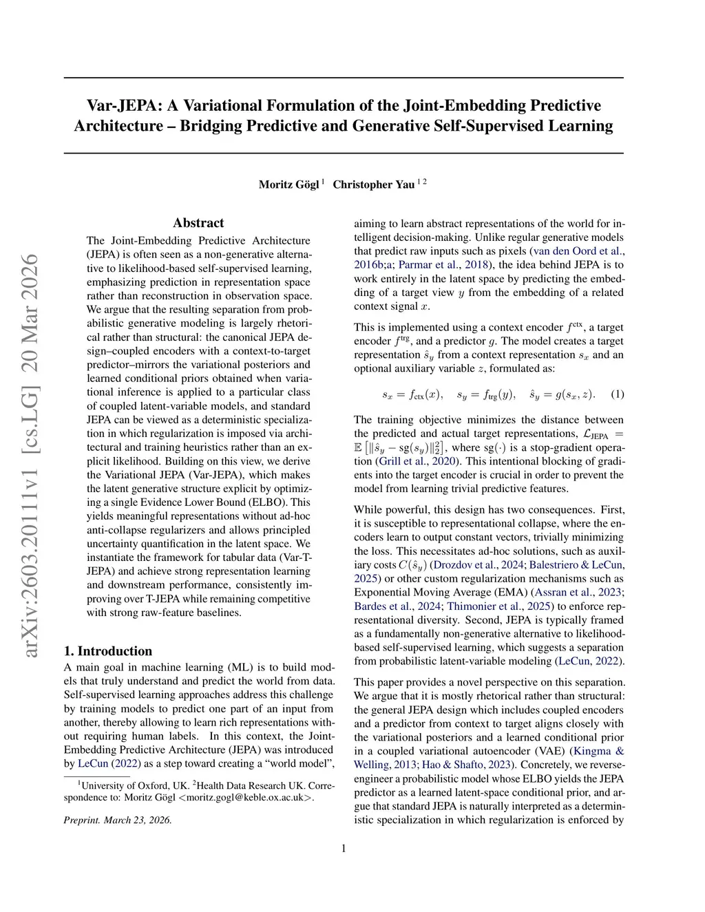 The Joint-Embedding Predictive Architecture (JEPA) is often seen as a non-generative alternative to likelihood-based self-supervised learning, emphasizing prediction in representation space rather than reconstruction in observation space. We argue that the resulting separation from probabilistic generative modeling is largely rhetorical rather than structural: the canonical JEPA design, coupled encoders with a context-to-target predictor, mirrors the variational posteriors and learned conditional priors obtained when variational inference is applied to a particular class of coupled latent-variable models, and standard JEPA can be viewed as a deterministic specialization in which regularization is imposed via architectural and training heuristics rather than an explicit likelihood. Building on this view, we derive the Variational JEPA (Var-JEPA), which makes the latent generative structure explicit by optimizing a single Evidence Lower Bound (ELBO). This yields meaningful representations without ad-hoc anti-collapse regularizers and allows principled uncertainty quantification in the latent space. We instantiate the framework for tabular data (Var-T-JEPA) and achieve strong representation learning and downstream performance, consistently improving over T-JEPA while remaining competitive with strong raw-feature baselines.