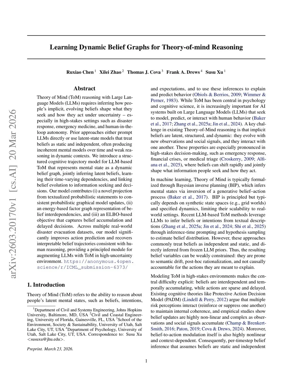 Theory of Mind (ToM) reasoning with Large Language Models (LLMs) requires inferring how people's implicit, evolving beliefs shape what they seek and how they act under uncertainty -- especially in high-stakes settings such as disaster response, emergency medicine, and human-in-the-loop autonomy. Prior approaches either prompt LLMs directly or use latent-state models that treat beliefs as static and independent, often producing incoherent mental models over time and weak reasoning in dynamic contexts. We introduce a structured cognitive trajectory model for LLM-based ToM that represents mental state as a dynamic belief graph, jointly inferring latent beliefs, learning their time-varying dependencies, and linking belief evolution to information seeking and decisions. Our model contributes (i) a novel projection from textualized probabilistic statements to consistent probabilistic graphical model updates, (ii) an energy-based factor graph representation of belief interdependencies, and (iii) an ELBO-based objective that captures belief accumulation and delayed decisions. Across multiple real-world disaster evacuation datasets, our model significantly improves action prediction and recovers interpretable belief trajectories consistent with human reasoning, providing a principled module for augmenting LLMs with ToM in high-uncertainty environment.this https URL
