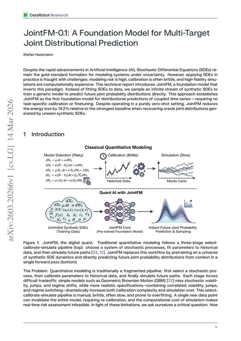 Despite the rapid advancements in Artificial Intelligence (AI), Stochastic Differential Equations (SDEs) remain the gold-standard formalism for modeling systems under uncertainty. However, applying SDEs in practice is fraught with challenges: modeling risk is high, calibration is often brittle, and high-fidelity simulations are computationally expensive. This technical report introduces JointFM, a foundation model that inverts this paradigm. Instead of fitting SDEs to data, we sample an infinite stream of synthetic SDEs to train a generic model to predict future joint probability distributions directly. This approach establishes JointFM as the first foundation model for distributional predictions of coupled time series - requiring no task-specific calibration or finetuning. Despite operating in a purely zero-shot setting, JointFM reduces the energy loss by 21.1% relative to the strongest baseline when recovering oracle joint distributions generated by unseen synthetic SDEs.