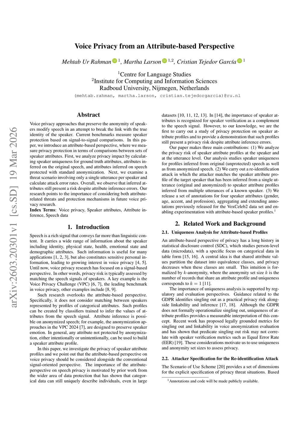 Voice privacy approaches that preserve the anonymity of speakers modify speech in an attempt to break the link with the true identity of the speaker. Current benchmarks measure speaker protection based on signal-to-signal comparisons. In this paper, we introduce an attribute-based perspective, where we measure privacy protection in terms of comparisons between sets of speaker attributes. First, we analyze privacy impact by calculating speaker uniqueness for ground truth attributes, attributes inferred on the original speech, and attributes inferred on speech protected with standard anonymization. Next, we examine a threat scenario involving only a single utterance per speaker and calculate attack error rates. Overall, we observe that inferred attributes still present a risk despite attribute inference errors. Our research points to the importance of considering both attribute-related threats and protection mechanisms in future voice privacy research.