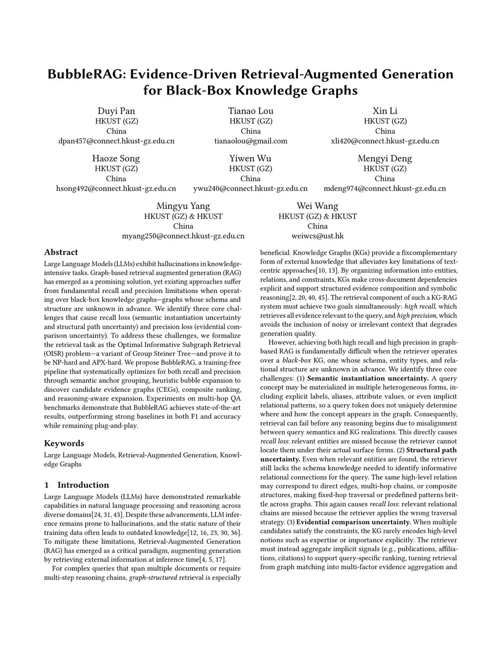 Large Language Models (LLMs) exhibit hallucinations in knowledge-intensive tasks. Graph-based retrieval augmented generation (RAG) has emerged as a promising solution, yet existing approaches suffer from fundamental recall and precision limitations when operating over black-box knowledge graphs -- graphs whose schema and structure are unknown in advance. We identify three core challenges that cause recall loss (semantic instantiation uncertainty and structural path uncertainty) and precision loss (evidential comparison uncertainty). To address these challenges, we formalize the retrieval task as the Optimal Informative Subgraph Retrieval (OISR) problem -- a variant of Group Steiner Tree -- and prove it to be NP-hard and APX-hard. We propose BubbleRAG, a training-free pipeline that systematically optimizes for both recall and precision through semantic anchor grouping, heuristic bubble expansion to discover candidate evidence graphs (CEGs), composite ranking, and reasoning-aware expansion. Experiments on multi-hop QA benchmarks demonstrate that BubbleRAG achieves state-of-the-art results, outperforming strong baselines in both F1 and accuracy while remaining plug-and-play.