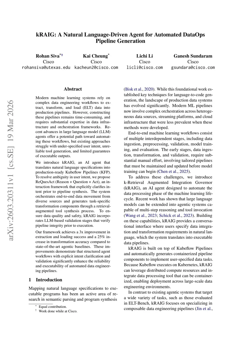 Modern machine learning systems rely on complex data engineering workflows to extract, transform, and load (ELT) data into production pipelines. However, constructing these pipelines remains time-consuming and requires substantial expertise in data infrastructure and orchestration frameworks. Recent advances in large language model (LLM) agents offer a potential path toward automating these workflows, but existing approaches struggle with under-specified user intent, unreliable tool generation, and limited guarantees of executable outputs.We introduce kRAIG, an AI agent that translates natural language specifications into production-ready Kubeflow Pipelines (KFP). To resolve ambiguity in user intent, we propose ReQuesAct (Reason, Question, Act), an interaction framework that explicitly clarifies intent prior to pipeline synthesis. The system orchestrates end-to-end data movement from diverse sources and generates task-specific transformation components through a retrieval-augmented tool synthesis process. To ensure data quality and safety, kRAIG incorporates LLM-based validation stages that verify pipeline integrity prior to execution.Our framework achieves a 3x improvement in extraction and loading success and a 25 percent increase in transformation accuracy compared to state-of-the-art agentic baselines. These improvements demonstrate that structured agent workflows with explicit intent clarification and validation significantly enhance the reliability and executability of automated data engineering pipelines.