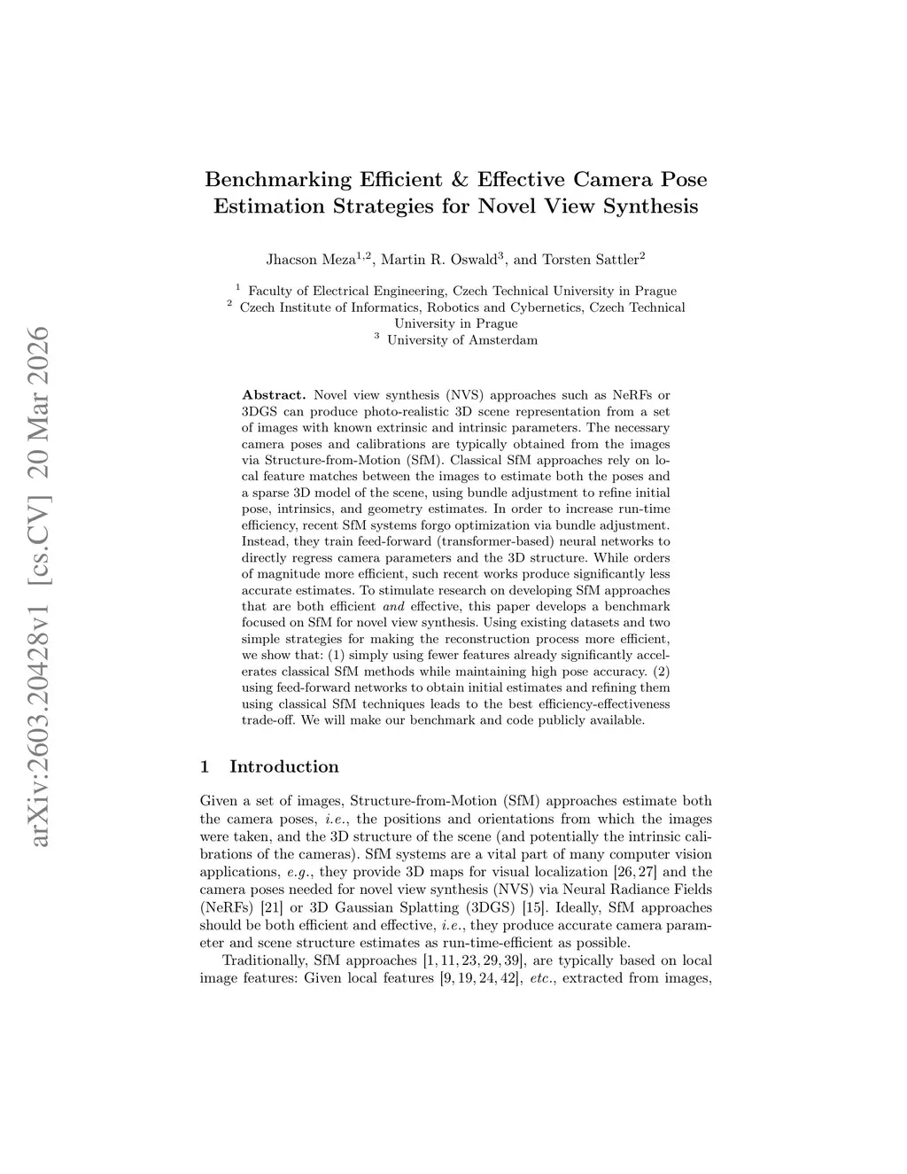 Novel view synthesis (NVS) approaches such as NeRFs or 3DGS can produce photo-realistic 3D scene representation from a set of images with known extrinsic and intrinsic parameters. The necessary camera poses and calibrations are typically obtained from the images via Structure-from-Motion (SfM). Classical SfM approaches rely on local feature matches between the images to estimate both the poses and a sparse 3D model of the scene, using bundle adjustment to refine initial pose, intrinsics, and geometry estimates. In order to increase run-time efficiency, recent SfM systems forgo optimization via bundle adjustment. Instead, they train feed-forward (transformer-based) neural networks to directly regress camera parameters and the 3D structure. While orders of magnitude more efficient, such recent works produce significantly less accurate estimates. To stimulate research on developing SfM approaches that are both efficient \emph{and} effective, this paper develops a benchmark focused on SfM for novel view synthesis. Using existing datasets and two simple strategies for making the reconstruction process more efficient, we show that: (1) simply using fewer features already significantly accelerates classical SfM methods while maintaining high pose accuracy. (2) using feed-forward networks to obtain initial estimates and refining them using classical SfM techniques leads to the best efficiency-effectiveness trade-off. We will make our benchmark and code publicly available.