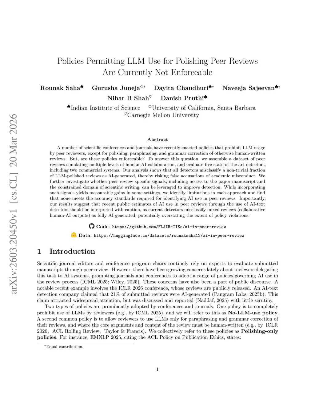 A number of scientific conferences and journals have recently enacted policies that prohibit LLM usage by peer reviewers, except for polishing, paraphrasing, and grammar correction of otherwise human-written reviews. But, are these policies enforceable? To answer this question, we assemble a dataset of peer reviews simulating multiple levels of human-AI collaboration, and evaluate five state-of-the-art detectors, including two commercial systems. Our analysis shows that all detectors misclassify a non-trivial fraction of LLM-polished reviews as AI-generated, thereby risking false accusations of academic misconduct. We further investigate whether peer-review-specific signals, including access to the paper manuscript and the constrained domain of scientific writing, can be leveraged to improve detection. While incorporating such signals yields measurable gains in some settings, we identify limitations in each approach and find that none meets the accuracy standards required for identifying AI use in peer reviews. Importantly, our results suggest that recent public estimates of AI use in peer reviews through the use of AI-text detectors should be interpreted with caution, as current detectors misclassify mixed reviews (collaborative human-AI outputs) as fully AI generated, potentially overstating the extent of policy violations.