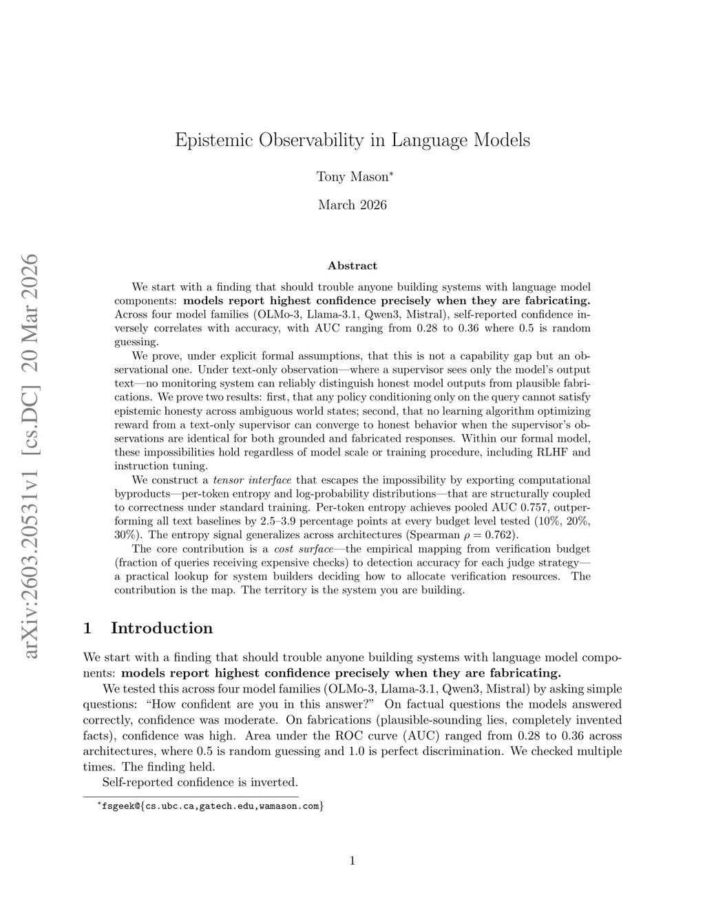 We find that models report highest confidence precisely when they are fabricating. Across four model families (OLMo-3, Llama-3.1, Qwen3, Mistral), self-reported confidence inversely correlates with accuracy, with AUC ranging from 0.28 to 0.36 where 0.5 is random guessing.We prove, under explicit formal assumptions, that this is not a capability gap but an observational one. Under text-only observation, where a supervisor sees only the model's output text, no monitoring system can reliably distinguish honest model outputs from plausible fabrications. We prove two results: first, that any policy conditioning only on the query cannot satisfy epistemic honesty across ambiguous world states; second, that no learning algorithm optimizing reward from a text-only supervisor can converge to honest behavior when the supervisor's observations are identical for both grounded and fabricated responses. Within our formal model, these impossibilities hold regardless of model scale or training procedure, including RLHF and instruction tuning.We construct a tensor interface that escapes the impossibility by exporting computational byproducts (per-token entropy and log-probability distributions) that are structurally coupled to correctness under standard training. Per-token entropy achieves pooled AUC 0.757, outperforming all text baselines by 2.5--3.9 percentage points at every budget level tested (10\%, 20\%, 30\%). The entropy signal generalizes across architectures (Spearman ).The core contribution is a cost surface where the empirical mapping from verification budget (fraction of queries receiving expensive checks) to detection accuracy for each judge strategy is a practical lookup for system builders deciding how to allocate verification resources. The contribution is the map. The territory is the system you are building.