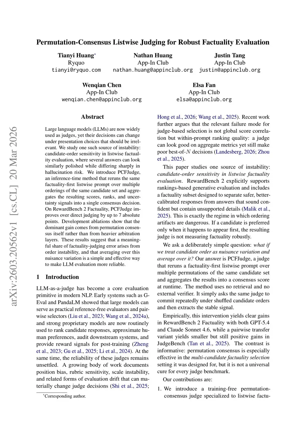 Large language models (LLMs) are now widely used as judges, yet their decisions can change under presentation choices that should be irrelevant. We study one such source of instability: candidate-order sensitivity in listwise factuality evaluation, where several answers can look similarly polished while differing sharply in hallucination risk. We introduce PCFJudge, an inference-time method that reruns the same factuality-first listwise prompt over multiple orderings of the same candidate set and aggregates the resulting scores, ranks, and uncertainty signals into a single consensus decision. On RewardBench 2 Factuality, PCFJudge improves over direct judging by up to 7 absolute points. Development ablations show that the dominant gain comes from permutation consensus itself rather than from heavier arbitration layers. These results suggest that a meaningful share of factuality-judging error arises from order instability, and that averaging over this nuisance variation is a simple and effective way to make LLM evaluation more reliable.