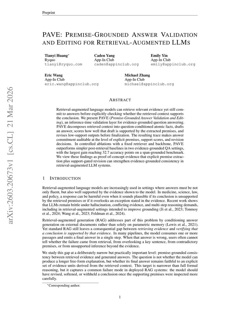 Retrieval-augmented language models can retrieve relevant evidence yet still commit to answers before explicitly checking whether the retrieved context supports the conclusion. We present PAVE (Premise-Grounded Answer Validation and Editing), an inference-time validation layer for evidence-grounded question answering. PAVE decomposes retrieved context into question-conditioned atomic facts, drafts an answer, scores how well that draft is supported by the extracted premises, and revises low-support outputs before finalization. The resulting trace makes answer commitment auditable at the level of explicit premises, support scores, and revision decisions. In controlled ablations with a fixed retriever and backbone, PAVE outperforms simpler post-retrieval baselines in two evidence-grounded QA settings, with the largest gain reaching 32.7 accuracy points on a span-grounded benchmark. We view these findings as proof-of-concept evidence that explicit premise extraction plus support-gated revision can strengthen evidence-grounded consistency in retrieval-augmented LLM systems.