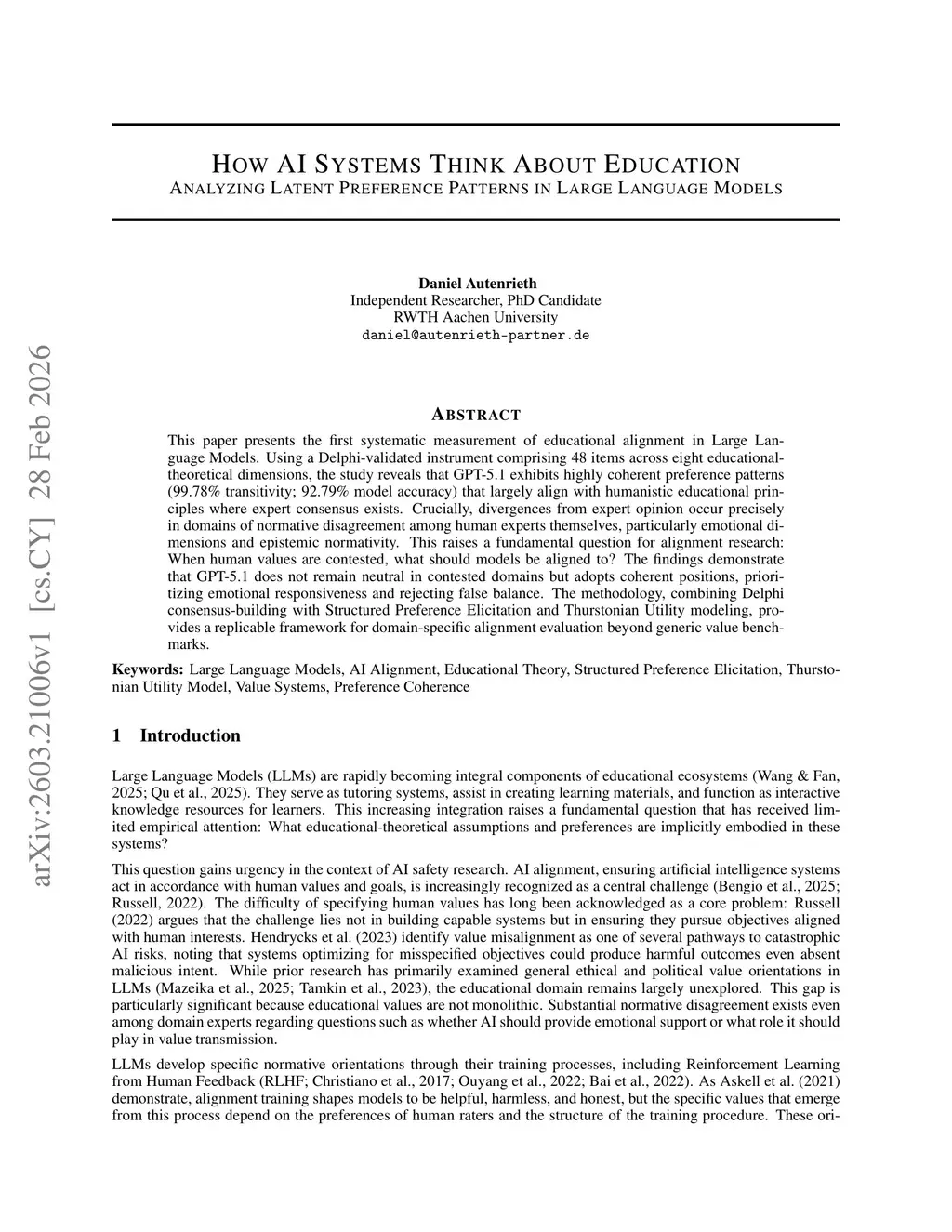 This paper presents the first systematic measurement of educational alignment in Large Language Models. Using a Delphi-validated instrument comprising 48 items across eight educational-theoretical dimensions, the study reveals that GPT-5.1 exhibits highly coherent preference patterns (99.78% transitivity; 92.79% model accuracy) that largely align with humanistic educational principles where expert consensus exists. Crucially, divergences from expert opinion occur precisely in domains of normative disagreement among human experts themselves, particularly emotional dimensions and epistemic normativity. This raises a fundamental question for alignment research: When human values are contested, what should models be aligned to? The findings demonstrate that GPT-5.1 does not remain neutral in contested domains but adopts coherent positions, prioritizing emotional responsiveness and rejecting false balance. The methodology, combining Delphi consensus-building with Structured Preference Elicitation and Thurstonian Utility modeling, provides a replicable framework for domain-specific alignment evaluation beyond generic value benchmarks.