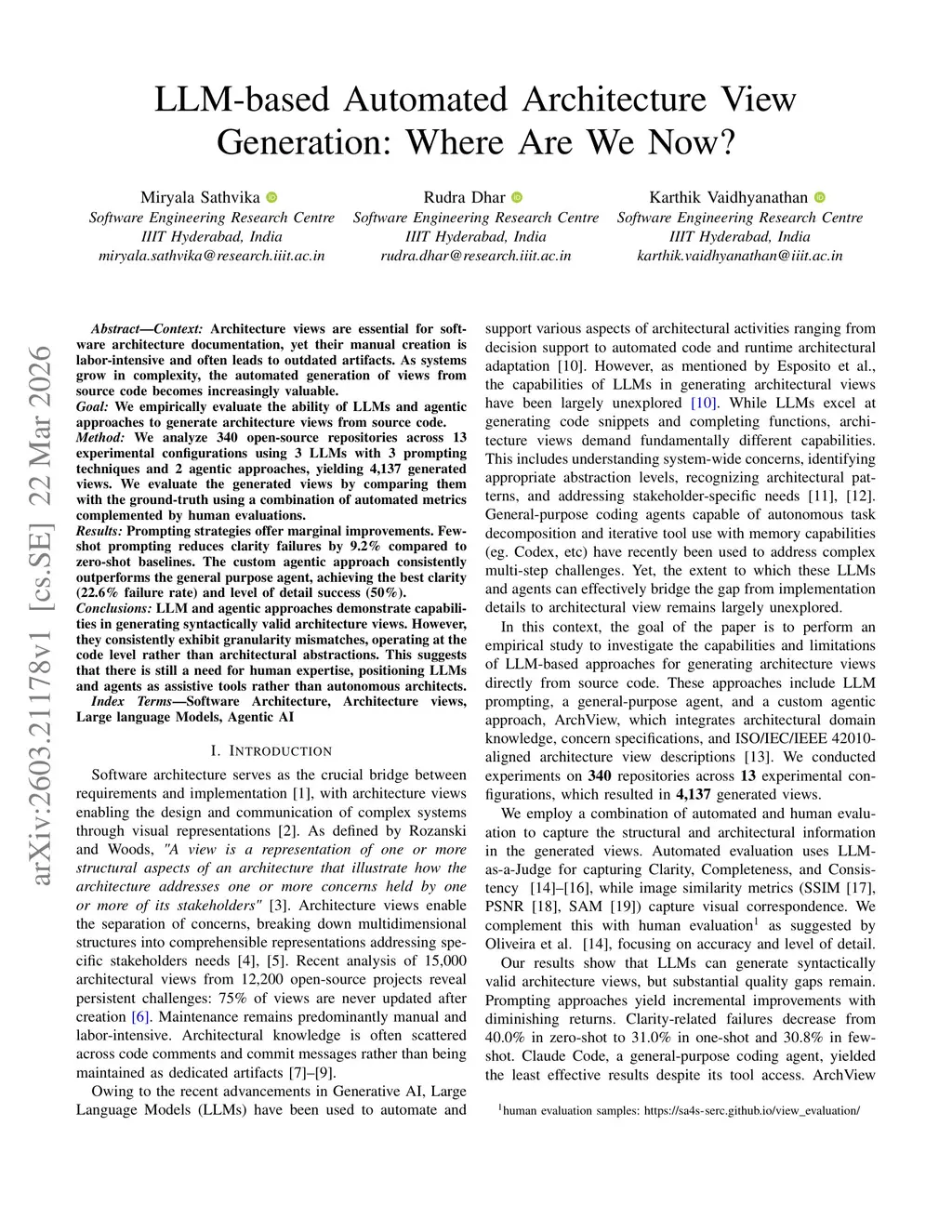 Architecture views are essential for software architecture documentation, yet their manual creation is labor intensive and often leads to outdated artifacts. As systems grow in complexity, the automated generation of views from source code becomes increasingly valuable. Goal: We empirically evaluate the ability of LLMs and agentic approaches to generate architecture views from source code. Method: We analyze 340 open-source repositories across 13 experimental configurations using 3 LLMs with 3 prompting techniques and 2 agentic approaches, yielding 4,137 generated views. We evaluate the generated views by comparing them with the ground-truth using a combination of automated metrics complemented by human evaluations. Results: Prompting strategies offer marginal improvements. Few-shot prompting reduces clarity failures by 9.2% compared to zero-shot baselines. The custom agentic approach consistently outperforms the general-purpose agent, achieving the best clarity (22.6% failure rate) and level-of-detail success (50%). Conclusions: LLM and agentic approaches demonstrate capabilities in generating syntactically valid architecture views. However, they consistently exhibit granularity mismatches, operating at the code level rather than architectural abstractions. This suggests that there is still a need for human expertise, positioning LLMs and agents as assistive tools rather than autonomous architects.