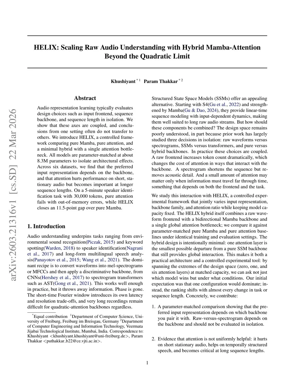 Audio representation learning typically evaluates design choices such as input frontend, sequence backbone, and sequence length in isolation. We show that these axes are coupled, and conclusions from one setting often do not transfer to others. We introduce HELIX, a controlled framework comparing pure Mamba, pure attention, and a minimal hybrid with a single attention bottleneck. All models are parameter-matched at about 8.3M parameters to isolate architectural effects. Across six datasets, we find that the preferred input representation depends on the backbone, and that attention hurts performance on short, stationary audio but becomes important at longer sequence lengths. On a 5-minute speaker identification task with 30,000 tokens, pure attention fails with out-of-memory errors, while HELIX closes an 11.5-point gap over pure Mamba.