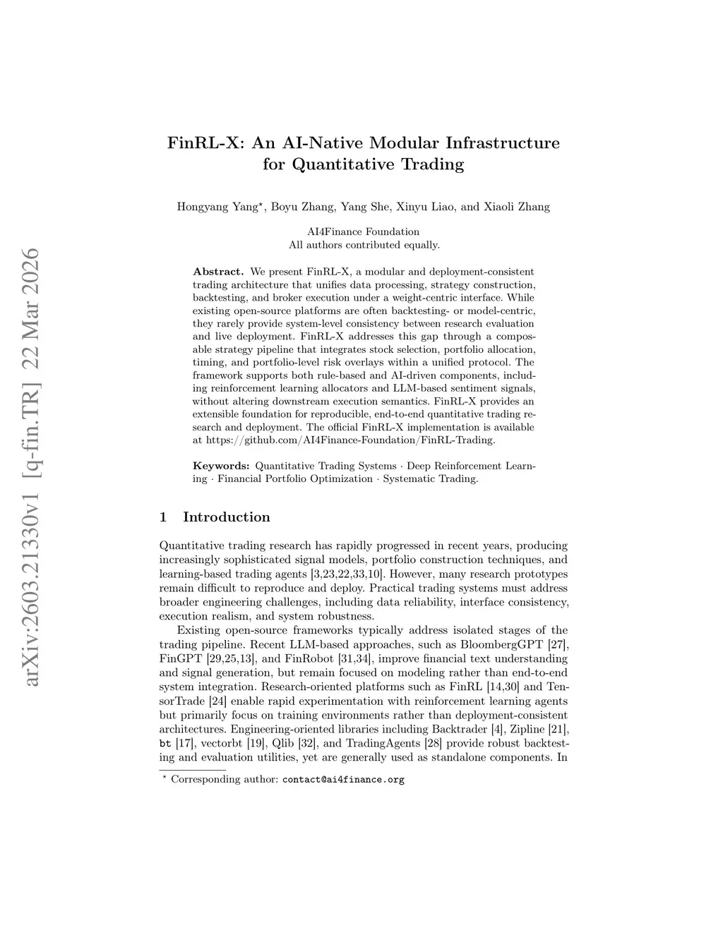 We present FinRL-X, a modular and deployment-consistent trading architecture that unifies data processing, strategy construction, backtesting, and broker execution under a weight-centric interface. While existing open-source platforms are often backtesting- or model-centric, they rarely provide system-level consistency between research evaluation and live deployment. FinRL-X addresses this gap through a composable strategy pipeline that integrates stock selection, portfolio allocation, timing, and portfolio-level risk overlays within a unified protocol. The framework supports both rule-based and AI-driven components, including reinforcement learning allocators and LLM-based sentiment signals, without altering downstream execution semantics. FinRL-X provides an extensible foundation for reproducible, end-to-end quantitative trading research and deployment. The official FinRL-X implementation is available atthis https URL.