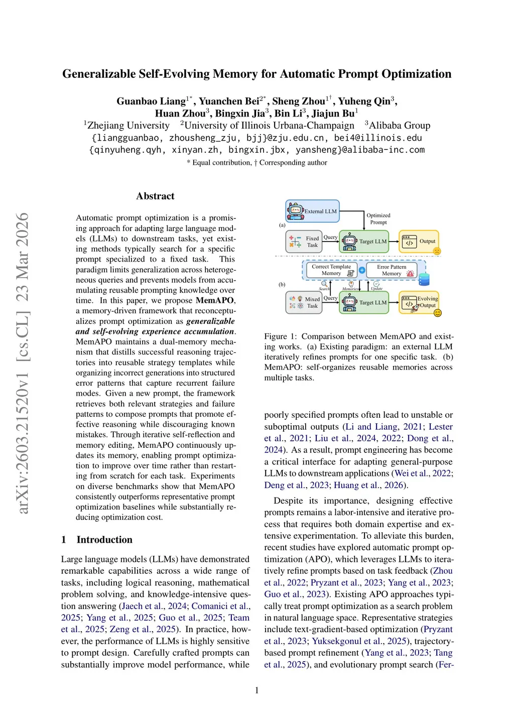 Automatic prompt optimization is a promising approach for adapting large language models (LLMs) to downstream tasks, yet existing methods typically search for a specific prompt specialized to a fixed task. This paradigm limits generalization across heterogeneous queries and prevents models from accumulating reusable prompting knowledge over time. In this paper, we propose MemAPO, a memory-driven framework that reconceptualizes prompt optimization as generalizable and self-evolving experience accumulation. MemAPO maintains a dual-memory mechanism that distills successful reasoning trajectories into reusable strategy templates while organizing incorrect generations into structured error patterns that capture recurrent failure modes. Given a new prompt, the framework retrieves both relevant strategies and failure patterns to compose prompts that promote effective reasoning while discouraging known mistakes. Through iterative self-reflection and memory editing, MemAPO continuously updates its memory, enabling prompt optimization to improve over time rather than restarting from scratch for each task. Experiments on diverse benchmarks show that MemAPO consistently outperforms representative prompt optimization baselines while substantially reducing optimization cost.