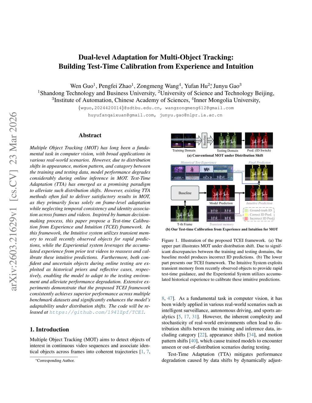 Dual-level Adaptation for Multi-Object Tracking: Building Test-Time Calibration from Experience and Intuition
