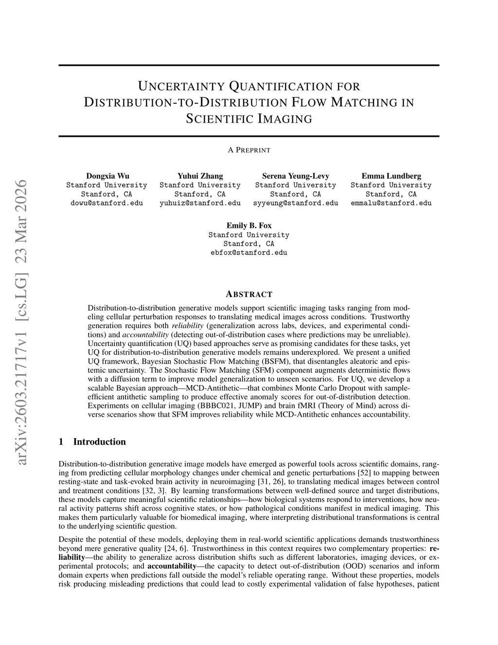 Distribution-to-distribution generative models support scientific imaging tasks ranging from modeling cellular perturbation responses to translating medical images across conditions. Trustworthy generation requires both reliability (generalization across labs, devices, and experimental conditions) and accountability (detecting out-of-distribution cases where predictions may be unreliable). Uncertainty quantification (UQ) based approaches serve as promising candidates for these tasks, yet UQ for distribution-to-distribution generative models remains underexplored. We present a unified UQ framework, Bayesian Stochastic Flow Matching (BSFM), that disentangles aleatoric and epistemic uncertainty. The Stochastic Flow Matching (SFM) component augments deterministic flows with a diffusion term to improve model generalization to unseen scenarios. For UQ, we develop a scalable Bayesian approach -- MCD-Antithetic -- that combines Monte Carlo Dropout with sample-efficient antithetic sampling to produce effective anomaly scores for out-of-distribution detection. Experiments on cellular imaging (BBBC021, JUMP) and brain fMRI (Theory of Mind) across diverse scenarios show that SFM improves reliability while MCD-Antithetic enhances accountability.