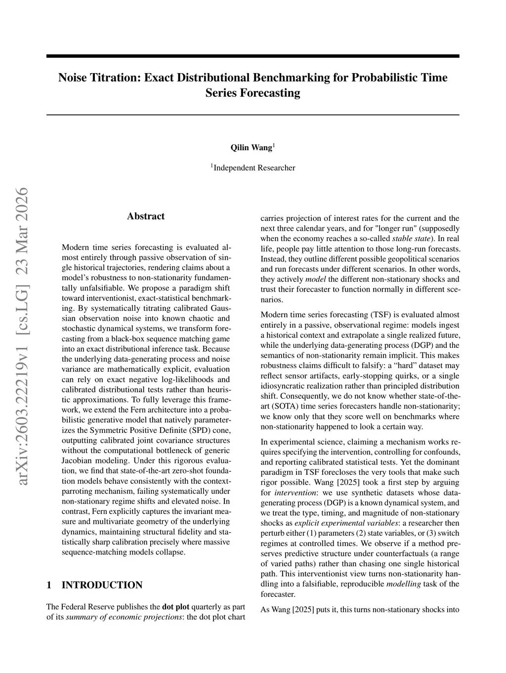 Modern time series forecasting is evaluated almost entirely through passive observation of single historical trajectories, rendering claims about a model's robustness to non-stationarity fundamentally unfalsifiable. We propose a paradigm shift toward interventionist, exact-statistical benchmarking. By systematically titrating calibrated Gaussian observation noise into known chaotic and stochastic dynamical systems, we transform forecasting from a black-box sequence matching game into an exact distributional inference task. Because the underlying data-generating process and noise variance are mathematically explicit, evaluation can rely on exact negative log-likelihoods and calibrated distributional tests rather than heuristic approximations. To fully leverage this framework, we extend the Fern architecture into a probabilistic generative model that natively parameterizes the Symmetric Positive Definite (SPD) cone, outputting calibrated joint covariance structures without the computational bottleneck of generic Jacobian modeling. Under this rigorous evaluation, we find that state-of-the-art zero-shot foundation models behave consistently with the context-parroting mechanism, failing systematically under non-stationary regime shifts and elevated noise. In contrast, Fern explicitly captures the invariant measure and multivariate geometry of the underlying dynamics, maintaining structural fidelity and statistically sharp calibration precisely where massive sequence-matching models collapse.