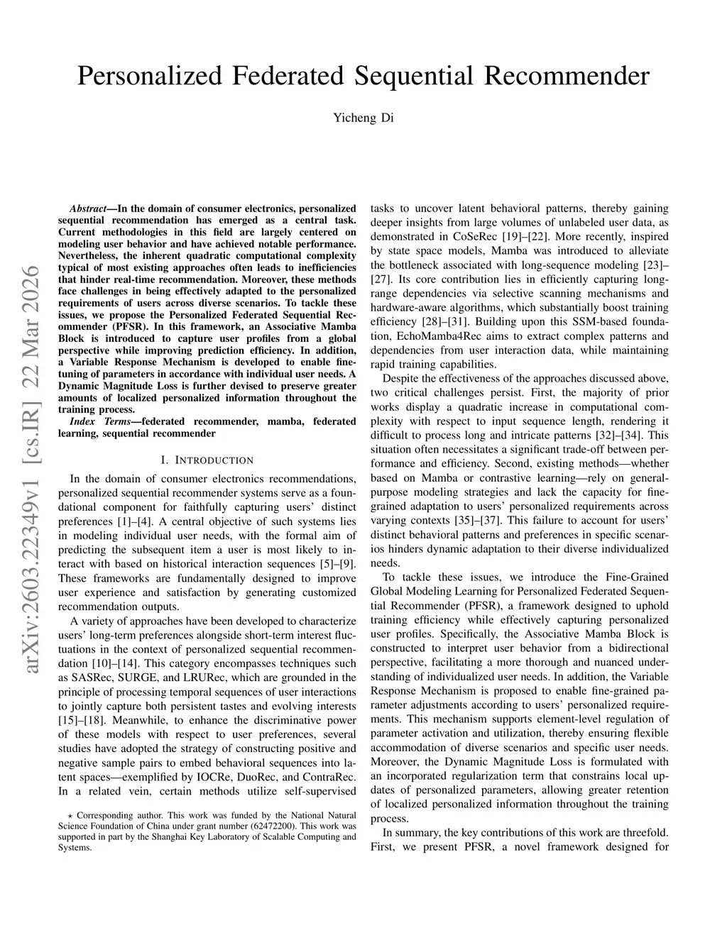 In the domain of consumer electronics, personalized sequential recommendation has emerged as a central task. Current methodologies in this field are largely centered on modeling user behavior and have achieved notable performance. Nevertheless, the inherent quadratic computational complexity typical of most existing approaches often leads to inefficiencies that hinder real-time recommendation. Moreover, these methods face challenges in being effectively adapted to the personalized requirements of users across diverse scenarios. To tackle these issues, we propose the Personalized Federated Sequential Recommender (PFSR). In this framework, an Associative Mamba Block is introduced to capture user profiles from a global perspective while improving prediction efficiency. In addition, a Variable Response Mechanism is developed to enable fine-tuning of parameters in accordance with individual user needs. A Dynamic Magnitude Loss is further devised to preserve greater amounts of localized personalized information throughout the training process.