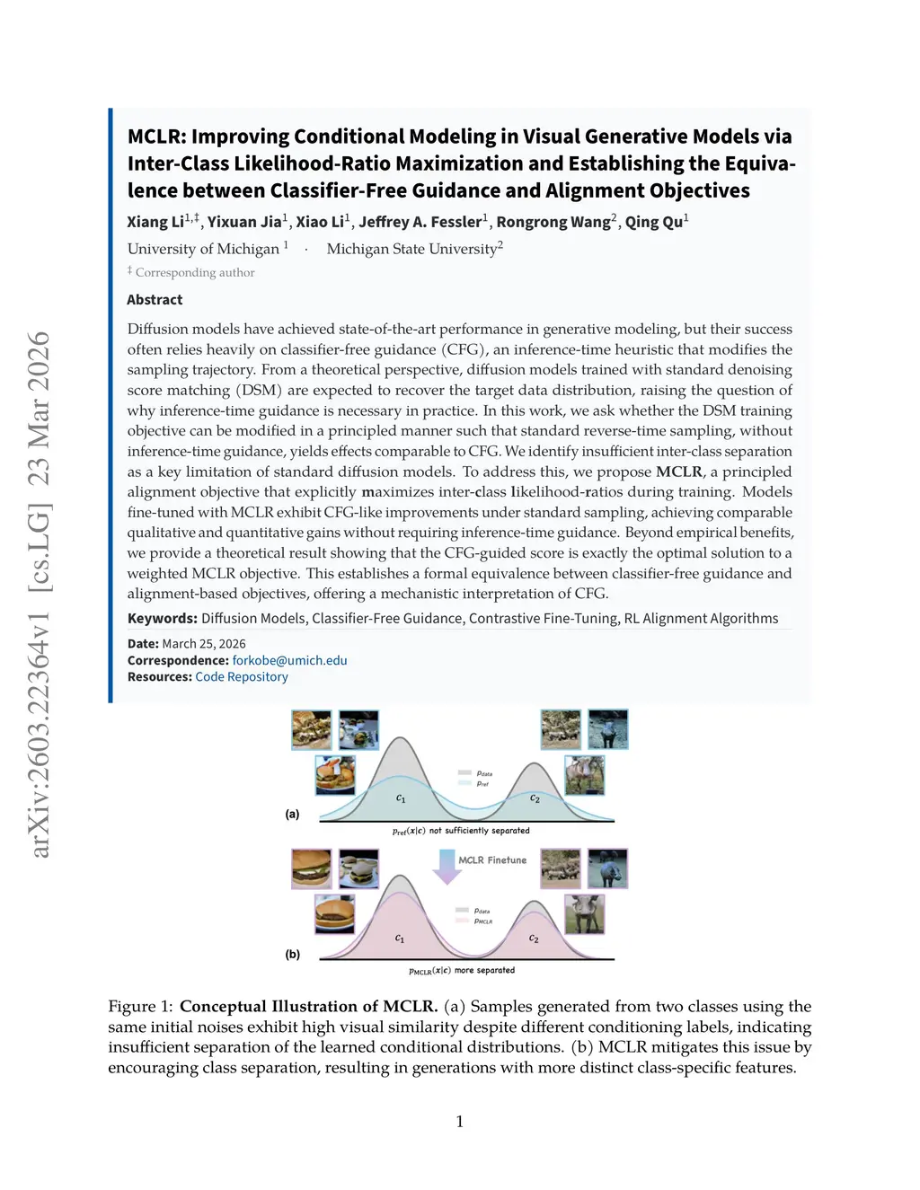 MCLR: Improving Conditional Modeling via Inter-Class Likelihood-Ratio Maximization and Unifying Classifier-Free Guidance with Alignment Objectives
