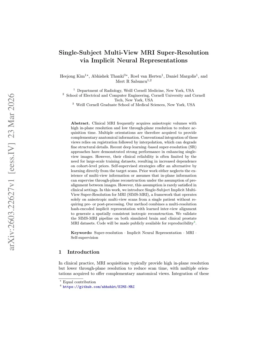 Clinical MRI frequently acquires anisotropic volumes with high in-plane resolution and low through-plane resolution to reduce acquisition time. Multiple orientations are therefore acquired to provide complementary anatomical information. Conventional integration of these views relies on registration followed by interpolation, which can degrade fine structural details. Recent deep learning-based super-resolution (SR) approaches have demonstrated strong performance in enhancing single-view images. However, their clinical reliability is often limited by the need for large-scale training datasets, resulting in increased dependence on cohort-level priors. Self-supervised strategies offer an alternative by learning directly from the target scans. Prior work either neglects the existence of multi-view information or assumes that in-plane information can supervise through-plane reconstruction under the assumption of pre-alignment between images. However, this assumption is rarely satisfied in clinical settings. In this work, we introduce Single-Subject Implicit Multi-View Super-Resolution for MRI (SIMS-MRI), a framework that operates solely on anisotropic multi-view scans from a single patient without requiring pre- or post-processing. Our method combines a multi-resolution hash-encoded implicit representation with learned inter-view alignment to generate a spatially consistent isotropic reconstruction. We validate the SIMS-MRI pipeline on both simulated brain and clinical prostate MRI datasets. Code will be made publicly available for reproducibility:this https URL