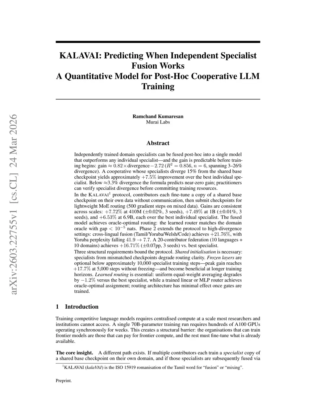 Independently trained domain specialists can be fused post-hoc into a single model that outperforms any individual specialist, and the gain is predictable: gain = 0.82 x divergence - 2.72 (R^2 = 0.856, n=6, 3-26% divergence). This enables practitioners to estimate cooperative value before committing compute. Below ~3.3% divergence, gains approachthis http URLthe KALAVAI protocol, contributors fine-tune copies of a shared checkpoint independently, then submit for lightweight MoE routing (500 steps). Gains are consistent: +7.72% at 410M (+/-0.02%, 3 seeds), +7.49% at 1B (+/-0.01%, 3 seeds), +6.53% at 6.9B, each over the best specialist. The router matches domain-oracle routing within <10^{-5} nats. Cross-lingual fusion (Tamil/Yoruba/Welsh/Code) achieves +21.76%, with Yoruba perplexity falling 41.9 to 7.7. A 20-contributor federation achieves +16.71% (+/-0.07pp, 3 seeds).Three requirements bound the protocol. Shared initialisation is necessary: checkpoint mismatch degrades routing. Frozen layers are optional below ~10,000 steps and beneficial beyond. Learned routing is essential: uniform averaging degrades by -1.2% vs. best specialist, while any trained router achieves oracle-optimal assignment.