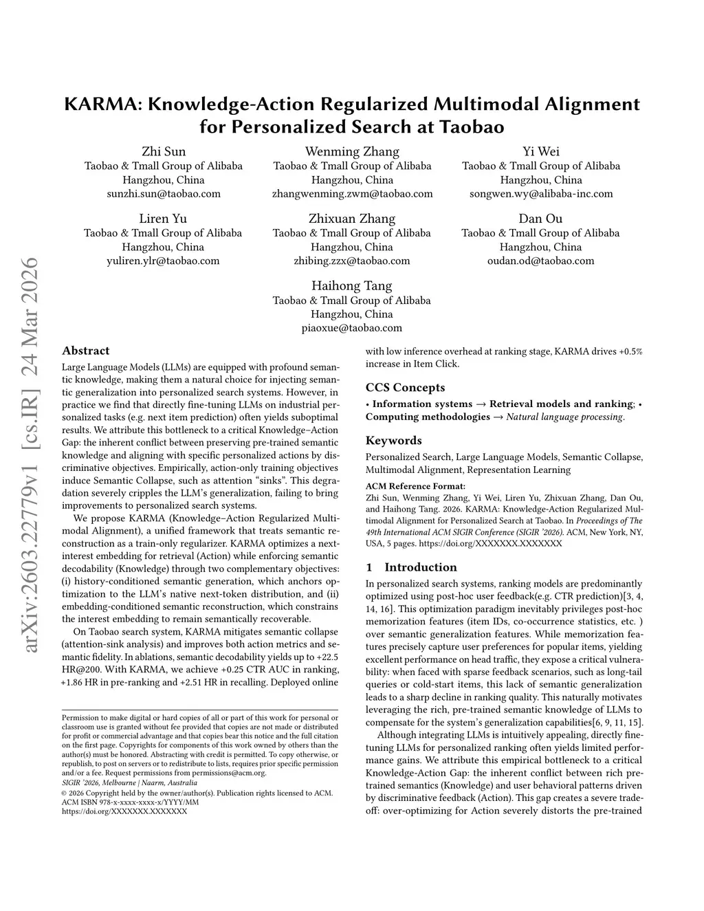 Large Language Models (LLMs) are equipped with profound semantic knowledge, making them a natural choice for injecting semantic generalization into personalized search systems. However, in practice we find that directly fine-tuning LLMs on industrial personalized tasks (e.g. next item prediction) often yields suboptimal results. We attribute this bottleneck to a critical Knowledge--Action Gap: the inherent conflict between preserving pre-trained semantic knowledge and aligning with specific personalized actions by discriminative objectives. Empirically, action-only training objectives induce Semantic Collapse, such as attention "sinks". This degradation severely cripples the LLM's generalization, failing to bring improvements to personalized search systems.We propose KARMA (Knowledge--Action Regularized Multimodal Alignment), a unified framework that treats semantic reconstruction as a train-only regularizer. KARMA optimizes a next-interest embedding for retrieval (Action) while enforcing semantic decodability (Knowledge) through two complementary objectives: (i) history-conditioned semantic generation, which anchors optimization to the LLM's native next-token distribution, and (ii) embedding-conditioned semantic reconstruction, which constrains the interest embedding to remain semantically recoverable.On Taobao search system, KARMA mitigates semantic collapse (attention-sink analysis) and improves both action metrics and semantic fidelity. In ablations, semantic decodability yields up to +22.5 HR@200. With KARMA, we achieve +0.25 CTR AUC in ranking, +1.86 HR in pre-ranking and +2.51 HR in recalling. Deployed online with low inference overhead at ranking & pre-ranking stage, KARMA drives +0.9% increase in GMV.