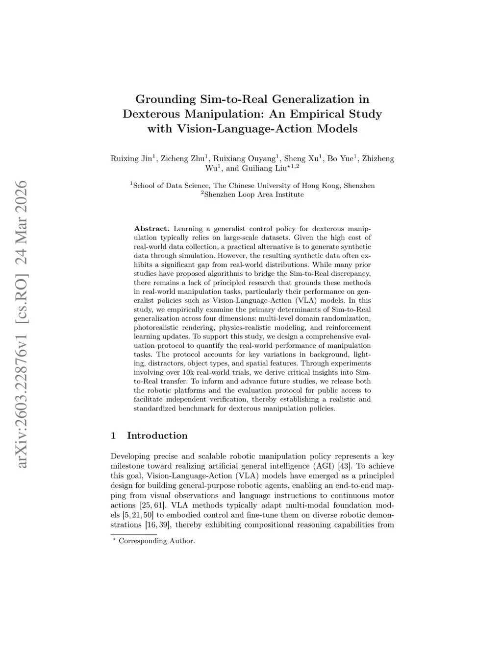 Learning a generalist control policy for dexterous manipulation typically relies on large-scale datasets. Given the high cost of real-world data collection, a practical alternative is to generate synthetic data through simulation. However, the resulting synthetic data often exhibits a significant gap from real-world distributions. While many prior studies have proposed algorithms to bridge the Sim-to-Real discrepancy, there remains a lack of principled research that grounds these methods in real-world manipulation tasks, particularly their performance on generalist policies such as Vision-Language-Action (VLA) models. In this study, we empirically examine the primary determinants of Sim-to-Real generalization across four dimensions: multi-level domain randomization, photorealistic rendering, physics-realistic modeling, and reinforcement learning updates. To support this study, we design a comprehensive evaluation protocol to quantify the real-world performance of manipulation tasks. The protocol accounts for key variations in background, lighting, distractors, object types, and spatial features. Through experiments involving over 10k real-world trials, we derive critical insights into Sim-to-Real transfer. To inform and advance future studies, we release both the robotic platforms and the evaluation protocol for public access to facilitate independent verification, thereby establishing a realistic and standardized benchmark for dexterous manipulation policies.