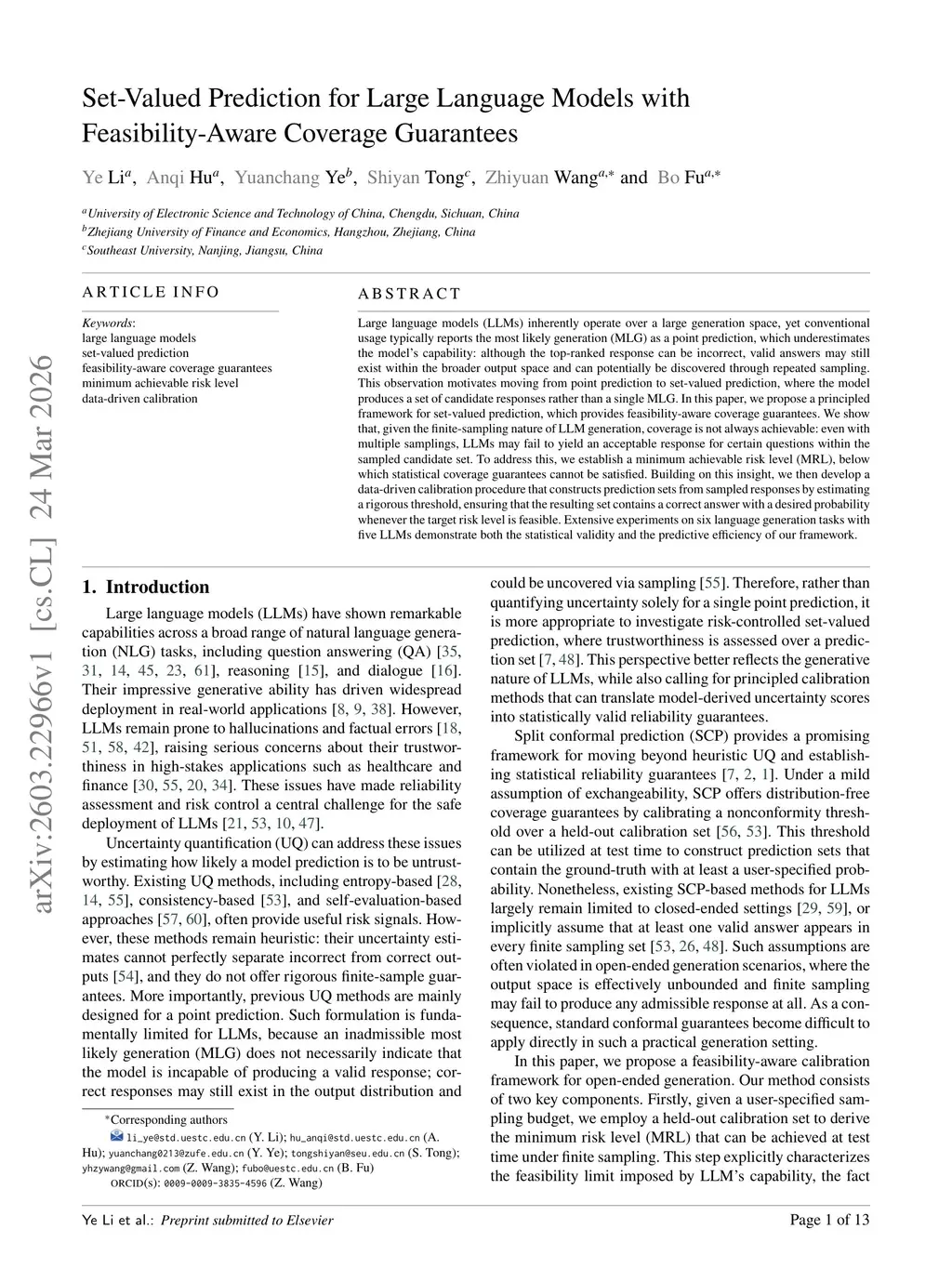 Large language models (LLMs) inherently operate over a large generation space, yet conventional usage typically reports the most likely generation (MLG) as a point prediction, which underestimates the model's capability: although the top-ranked response can be incorrect, valid answers may still exist within the broader output space and can potentially be discovered through repeated sampling. This observation motivates moving from point prediction to set-valued prediction, where the model produces a set of candidate responses rather than a single MLG. In this paper, we propose a principled framework for set-valued prediction, which provides feasibility-aware coverage guarantees. We show that, given the finite-sampling nature of LLM generation, coverage is not always achievable: even with multiple samplings, LLMs may fail to yield an acceptable response for certain questions within the sampled candidate set. To address this, we establish a minimum achievable risk level (MRL), below which statistical coverage guarantees cannot be satisfied. Building on this insight, we then develop a data-driven calibration procedure that constructs prediction sets from sampled responses by estimating a rigorous threshold, ensuring that the resulting set contains a correct answer with a desired probability whenever the target risk level is feasible. Extensive experiments on six language generation tasks with five LLMs demonstrate both the statistical validity and the predictive efficiency of our framework.