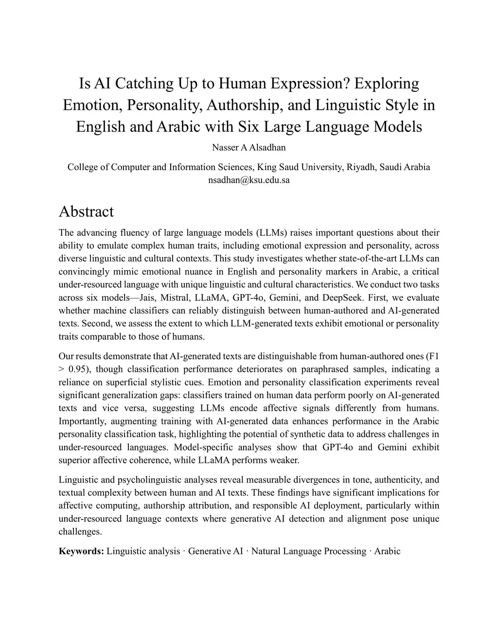 The advancing fluency of LLMs raises important questions about their ability to emulate complex human traits, including emotional expression and personality, across diverse linguistic and cultural contexts. This study investigates whether LLMs can convincingly mimic emotional nuance in English and personality markers in Arabic, a critical under-resourced language with unique linguistic and cultural characteristics. We conduct two tasks across six models:Jais, Mistral, LLaMA, GPT-4o, Gemini, and DeepSeek. First, we evaluate whether machine classifiers can reliably distinguish between human-authored and AI-generated texts. Second, we assess the extent to which LLM-generated texts exhibit emotional or personality traits comparable to those of humans. Our results demonstrate that AI-generated texts are distinguishable from human-authored ones (F1>0.95), though classification performance deteriorates on paraphrased samples, indicating a reliance on superficial stylistic cues. Emotion and personality classification experiments reveal significant generalization gaps: classifiers trained on human data perform poorly on AI-generated texts and vice versa, suggesting LLMs encode affective signals differently from humans. Importantly, augmenting training with AI-generated data enhances performance in the Arabic personality classification task, highlighting the potential of synthetic data to address challenges in under-resourced languages. Model-specific analyses show that GPT-4o and Gemini exhibit superior affective coherence. Linguistic and psycholinguistic analyses reveal measurable divergences in tone, authenticity, and textual complexity between human and AI texts. These findings have implications for affective computing, authorship attribution, and responsible AI deployment, particularly within underresourced language contexts where generative AI detection and alignment pose unique challenges.