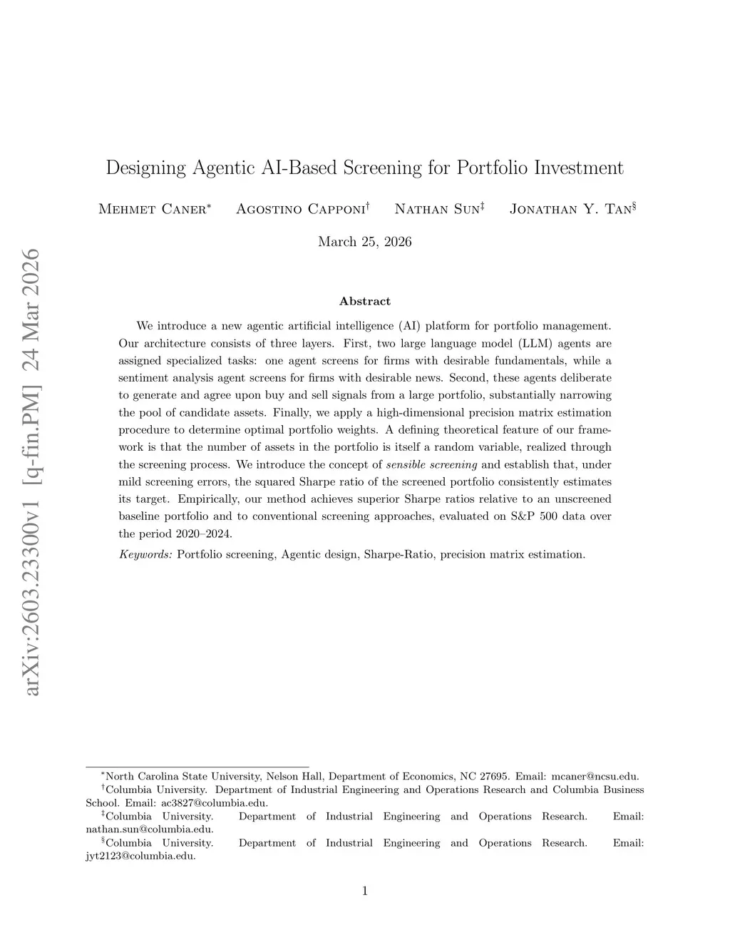 We introduce a new agentic artificial intelligence (AI) platform for portfolio management. Our architecture consists of three layers. First, two large language model (LLM) agents are assigned specialized tasks: one agent screens for firms with desirable fundamentals, while a sentiment analysis agent screens for firms with desirable news. Second, these agents deliberate to generate and agree upon buy and sell signals from a large portfolio, substantially narrowing the pool of candidate assets. Finally, we apply a high-dimensional precision matrix estimation procedure to determine optimal portfolio weights. A defining theoretical feature of our framework is that the number of assets in the portfolio is itself a random variable, realized through the screening process. We introduce the concept of sensible screening and establish that, under mild screening errors, the squared Sharpe ratio of the screened portfolio consistently estimates its target. Empirically, our method achieves superior Sharpe ratios relative to an unscreened baseline portfolio and to conventional screening approaches, evaluated on S&P 500 data over the period 2020--2024.