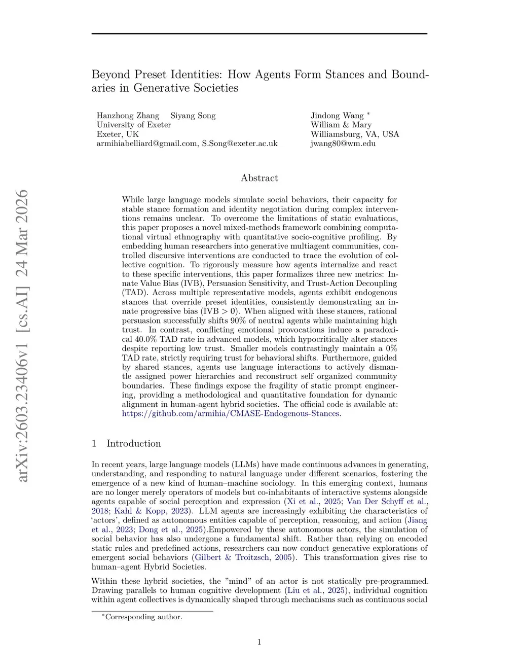 While large language models simulate social behaviors, their capacity for stable stance formation and identity negotiation during complex interventions remains unclear. To overcome the limitations of static evaluations, this paper proposes a novel mixed-methods framework combining computational virtual ethnography with quantitative socio-cognitive profiling. By embedding human researchers into generative multiagent communities, controlled discursive interventions are conducted to trace the evolution of collective cognition. To rigorously measure how agents internalize and react to these specific interventions, this paper formalizes three new metrics: Innate Value Bias (IVB), Persuasion Sensitivity, and Trust-Action Decoupling (TAD). Across multiple representative models, agents exhibit endogenous stances that override preset identities, consistently demonstrating an innate progressive bias (IVB > 0). When aligned with these stances, rational persuasion successfully shifts 90% of neutral agents while maintaining high trust. In contrast, conflicting emotional provocations induce a paradoxical 40.0% TAD rate in advanced models, which hypocritically alter stances despite reporting low trust. Smaller models contrastingly maintain a 0% TAD rate, strictly requiring trust for behavioral shifts. Furthermore, guided by shared stances, agents use language interactions to actively dismantle assigned power hierarchies and reconstruct self organized community boundaries. These findings expose the fragility of static prompt engineering, providing a methodological and quantitative foundation for dynamic alignment in human-agent hybrid societies. The official code is available at:this https URL