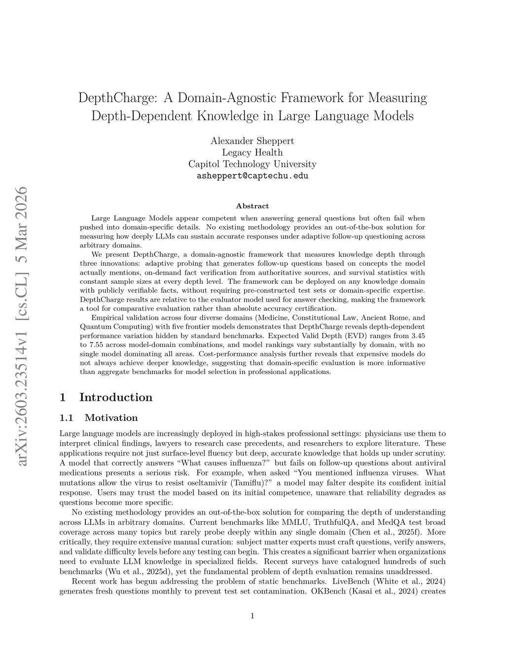 Large Language Models appear competent when answering general questions but often fail when pushed into domain-specific details. No existing methodology provides an out-of-the-box solution for measuring how deeply LLMs can sustain accurate responses under adaptive follow-up questioning across arbitrary domains.We present DepthCharge, a domain-agnostic framework that measures knowledge depth through three innovations: adaptive probing that generates follow-up questions based on concepts the model actually mentions, on-demand fact verification from authoritative sources, and survival statistics with constant sample sizes at every depth level. The framework can be deployed on any knowledge domain with publicly verifiable facts, without requiring pre-constructed test sets or domain-specific expertise. DepthCharge results are relative to the evaluator model used for answer checking, making the framework a tool for comparative evaluation rather than absolute accuracy certification.Empirical validation across four diverse domains (Medicine, Constitutional Law, Ancient Rome, and Quantum Computing) with five frontier models demonstrates that DepthCharge reveals depth-dependent performance variation hidden by standard benchmarks. Expected Valid Depth (EVD) ranges from 3.45 to 7.55 across model-domain combinations, and model rankings vary substantially by domain, with no single model dominating all areas. Cost-performance analysis further reveals that expensive models do not always achieve deeper knowledge, suggesting that domain-specific evaluation is more informative than aggregate benchmarks for model selection in professional applications.