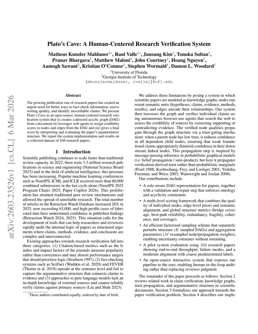 The growing publication rate of research papers has created an urgent need for better ways to fact-check information, assess writing quality, and identify unverifiable claims. We present Plato's Cave as an open-source, human-centered research verification system that (i) creates a directed acyclic graph (DAG) from a document, (ii) leverages web agents to assign credibility scores to nodes and edges from the DAG, and (iii) gives a final score by interpreting and evaluating the paper's argumentative structure. We report the system implementation and results on a collected dataset of 104 research papers.