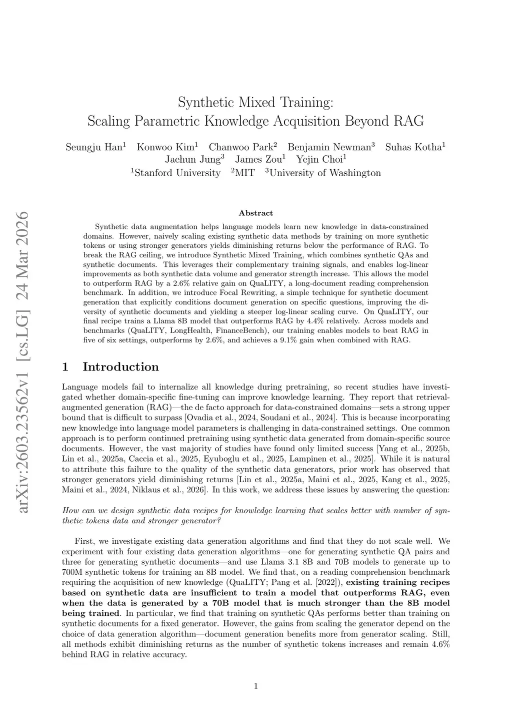 Synthetic Mixed Training: Scaling Parametric Knowledge Acquisition Beyond RAG