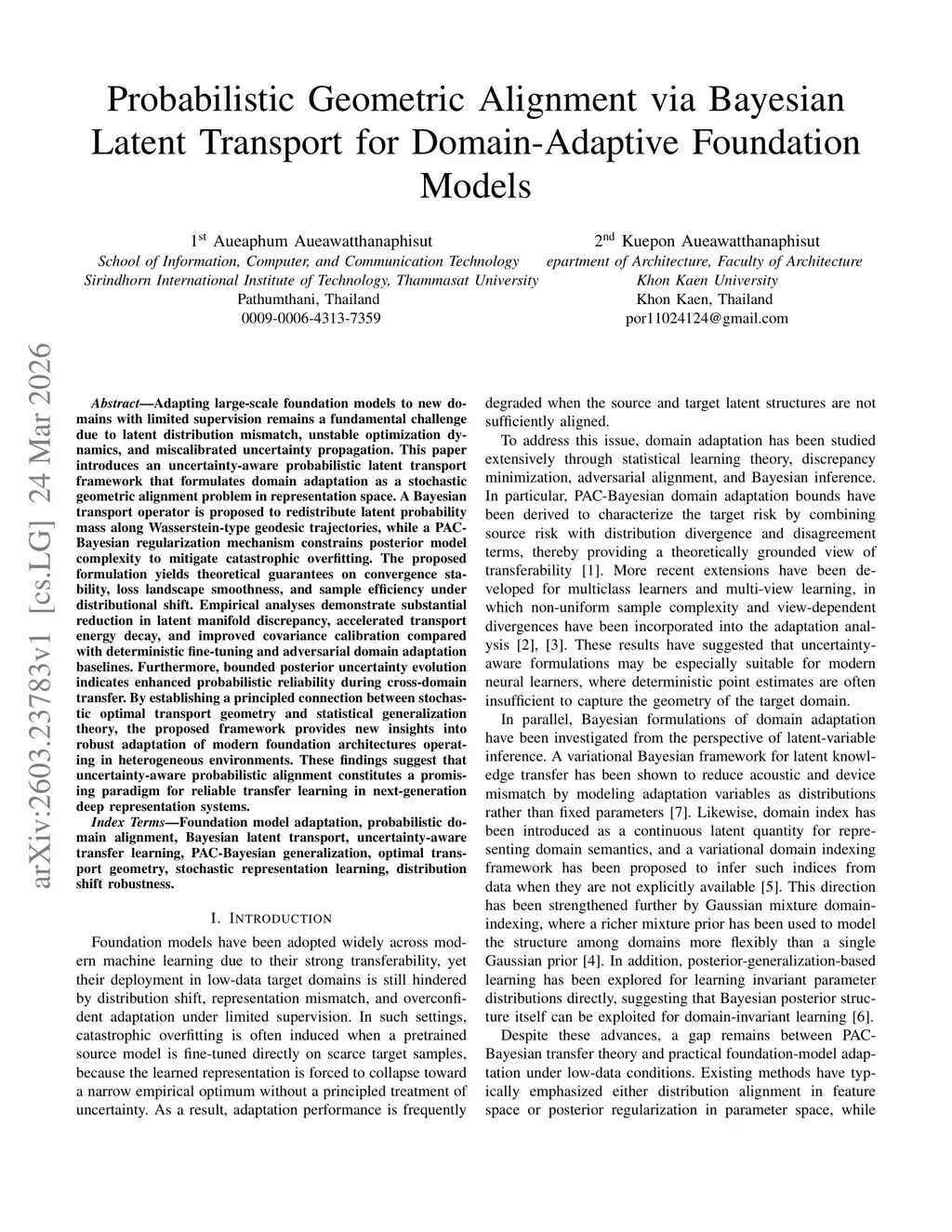 Adapting large-scale foundation models to new domains with limited supervision remains a fundamental challenge due to latent distribution mismatch, unstable optimization dynamics, and miscalibrated uncertainty propagation. This paper introduces an uncertainty-aware probabilistic latent transport framework that formulates domain adaptation as a stochastic geometric alignment problem in representation space. A Bayesian transport operator is proposed to redistribute latent probability mass along Wasserstein-type geodesic trajectories, while a PAC-Bayesian regularization mechanism constrains posterior model complexity to mitigate catastrophic overfitting. The proposed formulation yields theoretical guarantees on convergence stability, loss landscape smoothness, and sample efficiency under distributional shift. Empirical analyses demonstrate substantial reduction in latent manifold discrepancy, accelerated transport energy decay, and improved covariance calibration compared with deterministic fine-tuning and adversarial domain adaptation baselines. Furthermore, bounded posterior uncertainty evolution indicates enhanced probabilistic reliability during cross-domain transfer. By establishing a principled connection between stochastic optimal transport geometry and statistical generalization theory, the proposed framework provides new insights into robust adaptation of modern foundation architectures operating in heterogeneous environments. These findings suggest that uncertainty-aware probabilistic alignment constitutes a promising paradigm for reliable transfer learning in next-generation deep representation systems.