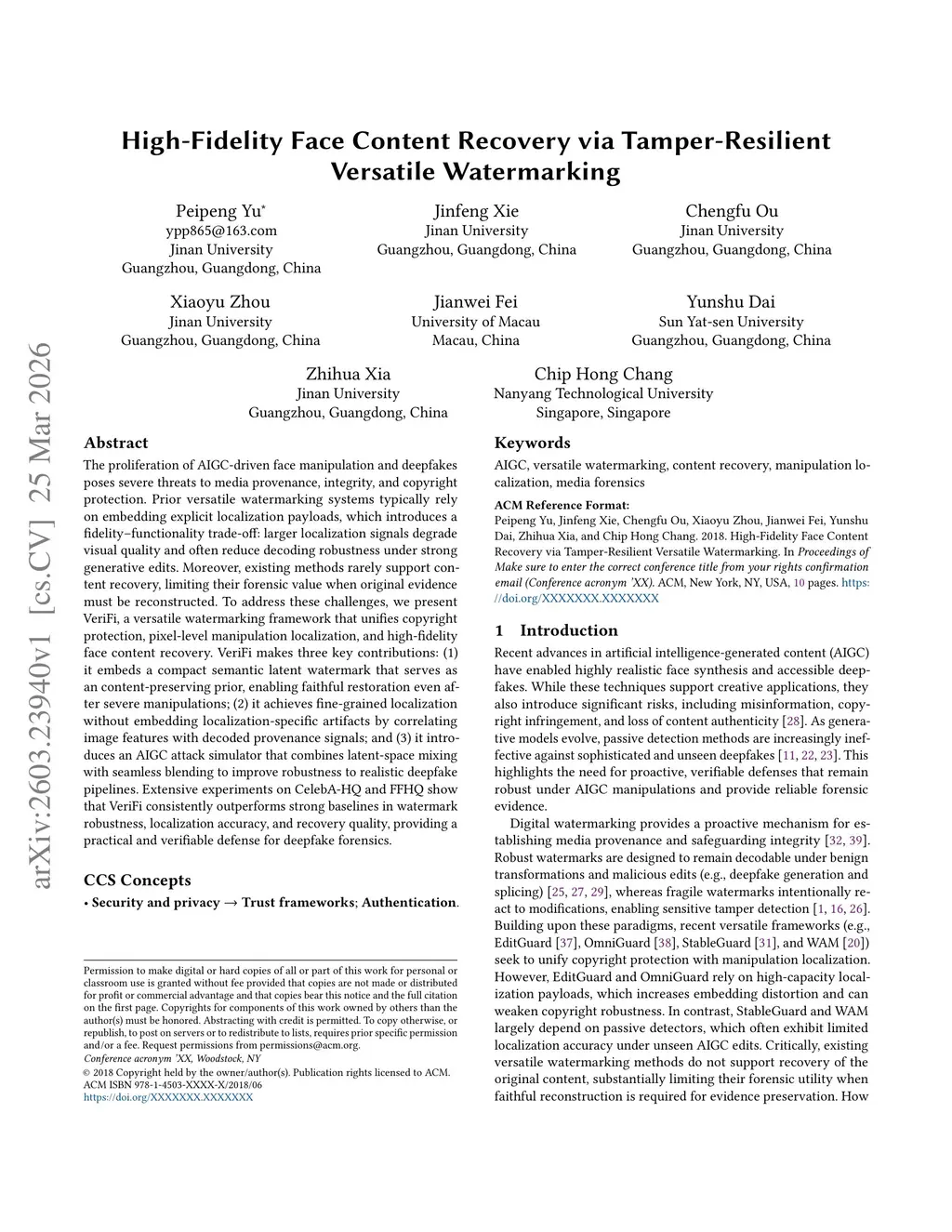 The proliferation of AIGC-driven face manipulation and deepfakes poses severe threats to media provenance, integrity, and copyright protection. Prior versatile watermarking systems typically rely on embedding explicit localization payloads, which introduces a fidelity--functionality trade-off: larger localization signals degrade visual quality and often reduce decoding robustness under strong generative edits. Moreover, existing methods rarely support content recovery, limiting their forensic value when original evidence must be reconstructed. To address these challenges, we present VeriFi, a versatile watermarking framework that unifies copyright protection, pixel-level manipulation localization, and high-fidelity face content recovery. VeriFi makes three key contributions: (1) it embeds a compact semantic latent watermark that serves as an content-preserving prior, enabling faithful restoration even after severe manipulations; (2) it achieves fine-grained localization without embedding localization-specific artifacts by correlating image features with decoded provenance signals; and (3) it introduces an AIGC attack simulator that combines latent-space mixing with seamless blending to improve robustness to realistic deepfake pipelines. Extensive experiments on CelebA-HQ and FFHQ show that VeriFi consistently outperforms strong baselines in watermark robustness, localization accuracy, and recovery quality, providing a practical and verifiable defense for deepfake forensics.