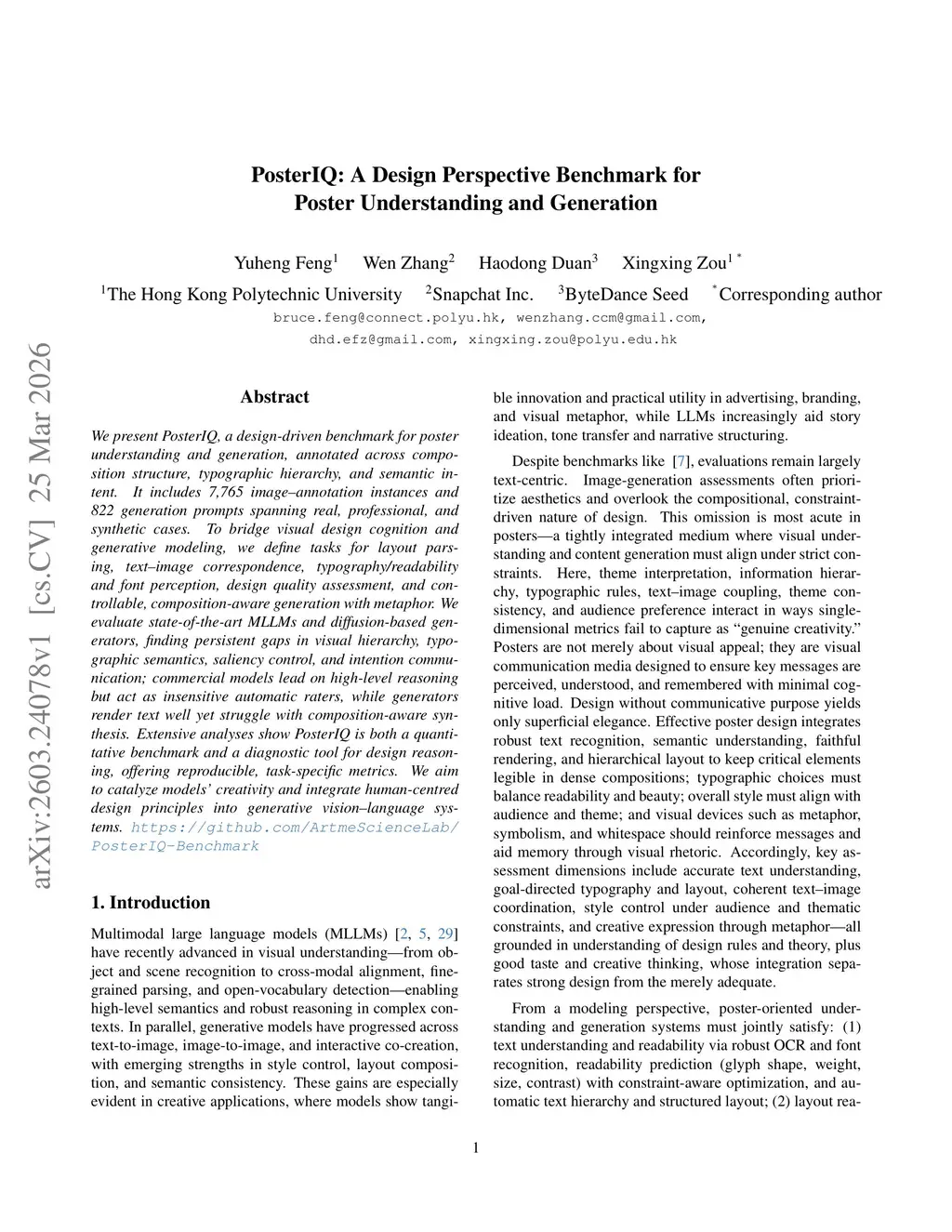 We present PosterIQ, a design-driven benchmark for poster understanding and generation, annotated across composition structure, typographic hierarchy, and semantic intent. It includes 7,765 image-annotation instances and 822 generation prompts spanning real, professional, and synthetic cases. To bridge visual design cognition and generative modeling, we define tasks for layout parsing, text-image correspondence, typography/readability and font perception, design quality assessment, and controllable, composition-aware generation with metaphor. We evaluate state-of-the-art MLLMs and diffusion-based generators, finding persistent gaps in visual hierarchy, typographic semantics, saliency control, and intention communication; commercial models lead on high-level reasoning but act as insensitive automatic raters, while generators render text well yet struggle with composition-aware synthesis. Extensive analyses show PosterIQ is both a quantitative benchmark and a diagnostic tool for design reasoning, offering reproducible, task-specific metrics. We aim to catalyze models' creativity and integrate human-centred design principles into generative vision-language systems.