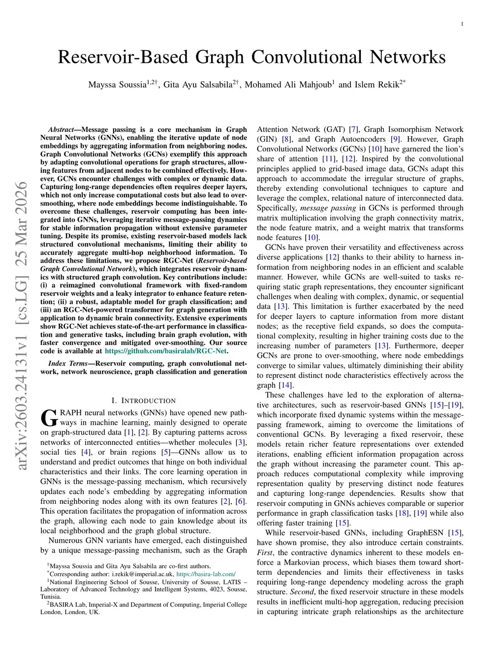 Message passing is a core mechanism in Graph Neural Networks (GNNs), enabling the iterative update of node embeddings by aggregating information from neighboring nodes. Graph Convolutional Networks (GCNs) exemplify this approach by adapting convolutional operations for graph structures, allowing features from adjacent nodes to be combined effectively. However, GCNs encounter challenges with complex or dynamic data. Capturing long-range dependencies often requires deeper layers, which not only increase computational costs but also lead to over-smoothing, where node embeddings become indistinguishable. To overcome these challenges, reservoir computing has been integrated into GNNs, leveraging iterative message-passing dynamics for stable information propagation without extensive parameter tuning. Despite its promise, existing reservoir-based models lack structured convolutional mechanisms, limiting their ability to accurately aggregate multi-hop neighborhood information. To address these limitations, we propose RGC-Net (Reservoir-based Graph Convolutional Network), which integrates reservoir dynamics with structured graph convolution. Key contributions include: (i) a reimagined convolutional framework with fixed random reservoir weights and a leaky integrator to enhance feature retention; (ii) a robust, adaptable model for graph classification; and (iii) an RGC-Net-powered transformer for graph generation with application to dynamic brain connectivity. Extensive experiments show that RGC-Net achieves state-of-the-art performance in classification and generative tasks, including brain graph evolution, with faster convergence and reduced over-smoothing. Source code is available atthis https URL.
