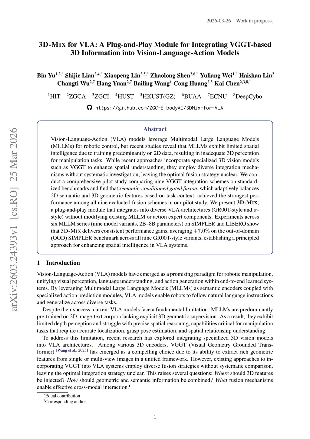 Vision-Language-Action (VLA) models leverage Multimodal Large Language Models (MLLMs) for robotic control, but recent studies reveal that MLLMs exhibit limited spatial intelligence due to training predominantly on 2D data, resulting in inadequate 3D perception for manipulation tasks. While recent approaches incorporate specialized 3D vision models such as VGGT to enhance spatial understanding, they employ diverse integration mechanisms without systematic investigation, leaving the optimal fusion strategy unclear. We conduct a comprehensive pilot study comparing nine VGGT integration schemes on standardized benchmarks and find that semantic-conditioned gated fusion, which adaptively balances 2D semantic and 3D geometric features based on task context, achieved the strongest performance among all nine evaluated fusion schemes in our pilot study. We present 3D-Mix, a plug-and-play module that integrates into diverse VLA architectures (GR00T-style and -style) without modifying existing MLLM or action expert components. Experiments across six MLLM series (nine model variants, 2B--8B parameters) on SIMPLER and LIBERO show that 3D-Mix delivers consistent performance gains, averaging +7.0% on the out-of-domain (OOD) SIMPLER benchmark across all nine GR00T-style variants, establishing a principled approach for enhancing spatial intelligence in VLA systems.