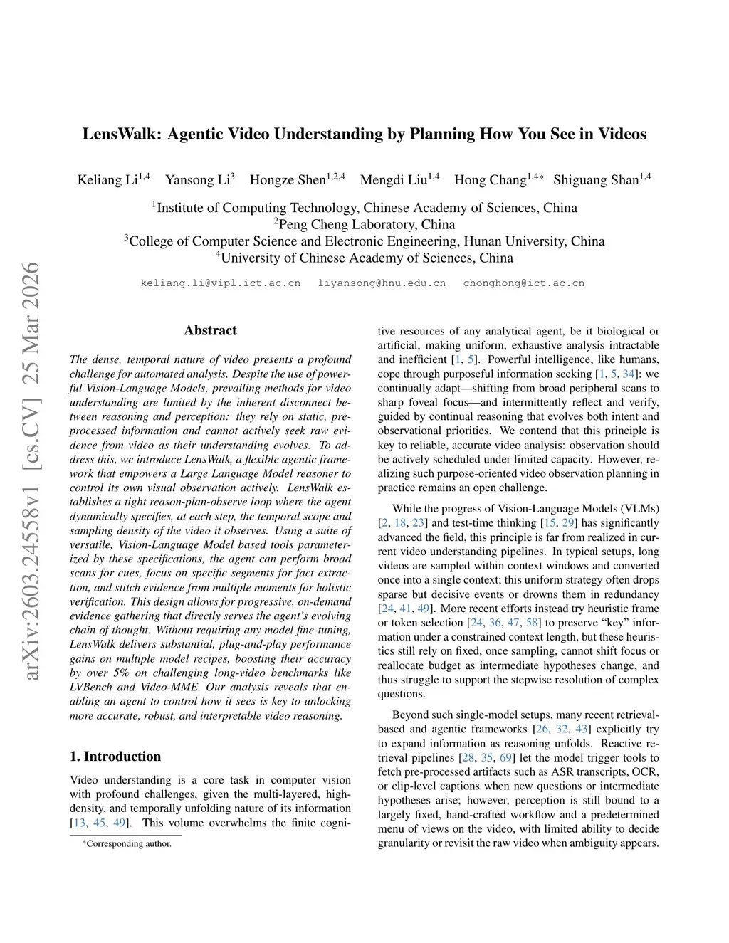 The dense, temporal nature of video presents a profound challenge for automated analysis. Despite the use of powerful Vision-Language Models, prevailing methods for video understanding are limited by the inherent disconnect between reasoning and perception: they rely on static, pre-processed information and cannot actively seek raw evidence from video as their understanding evolves. To address this, we introduce LensWalk, a flexible agentic framework that empowers a Large Language Model reasoner to control its own visual observation actively. LensWalk establishes a tight reason-plan-observe loop where the agent dynamically specifies, at each step, the temporal scope and sampling density of the video it observes. Using a suite of versatile, Vision-Language Model based tools parameterized by these specifications, the agent can perform broad scans for cues, focus on specific segments for fact extraction, and stitch evidence from multiple moments for holistic verification. This design allows for progressive, on-demand evidence gathering that directly serves the agent's evolving chain of thought. Without requiring any model fine-tuning, LensWalk delivers substantial, plug-and-play performance gains on multiple model recipes, boosting their accuracy by over 5\% on challenging long-video benchmarks like LVBench and Video-MME. Our analysis reveals that enabling an agent to control how it sees is key to unlocking more accurate, robust, and interpretable video reasoning.