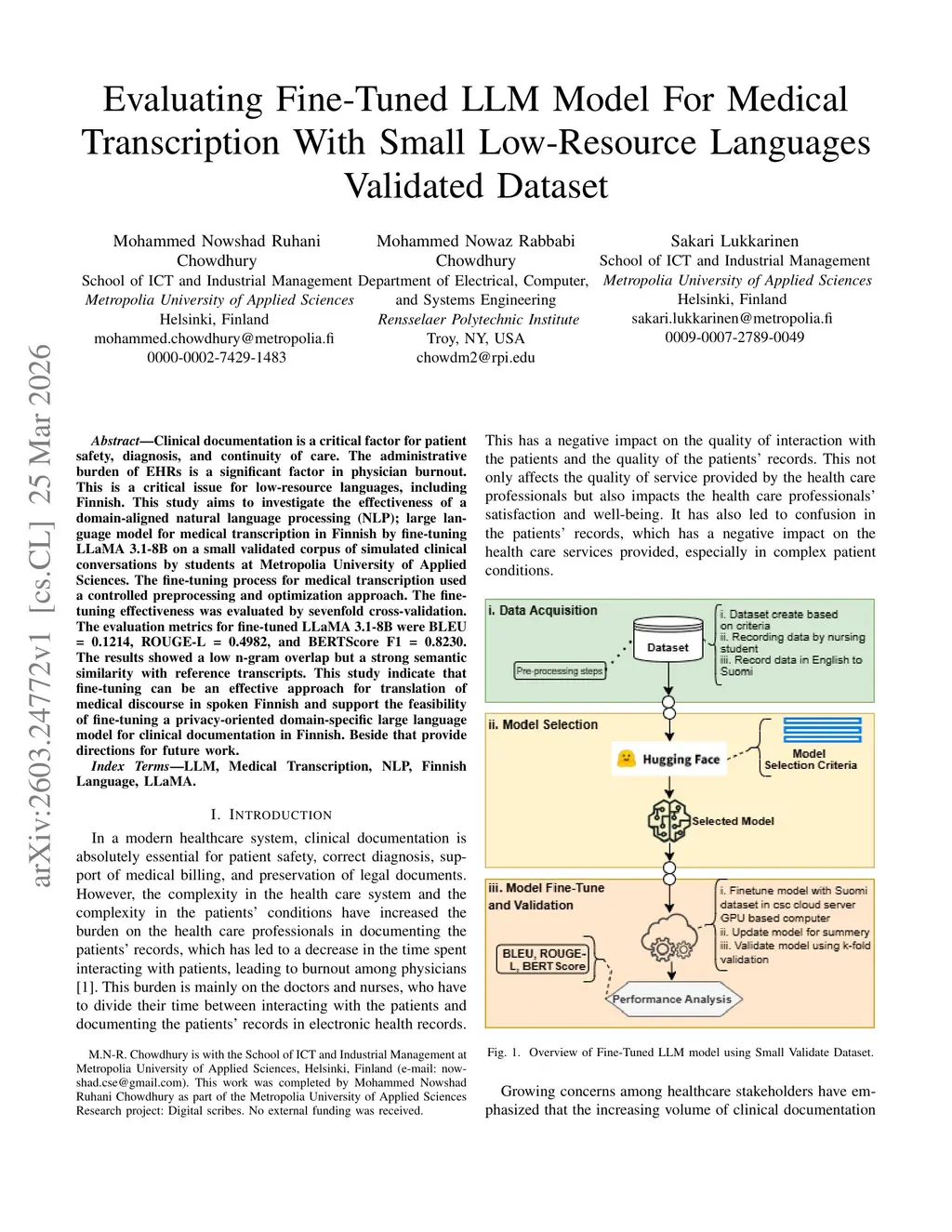 Clinical documentation is a critical factor for patient safety, diagnosis, and continuity of care. The administrative burden of EHRs is a significant factor in physician burnout. This is a critical issue for low-resource languages, including Finnish. This study aims to investigate the effectiveness of a domain-aligned natural language processing (NLP); large language model for medical transcription in Finnish by fine-tuning LLaMA 3.1-8B on a small validated corpus of simulated clinical conversations by students at Metropolia University of Applied Sciences. The fine-tuning process for medical transcription used a controlled preprocessing and optimization approach. The fine-tuning effectiveness was evaluated by sevenfold cross-validation. The evaluation metrics for fine-tuned LLaMA 3.1-8B were BLEU = 0.1214, ROUGE-L = 0.4982, and BERTScore F1 = 0.8230. The results showed a low n-gram overlap but a strong semantic similarity with reference transcripts. This study indicate that fine-tuning can be an effective approach for translation of medical discourse in spoken Finnish and support the feasibility of fine-tuning a privacy-oriented domain-specific large language model for clinical documentation in Finnish. Beside that provide directions for future work.