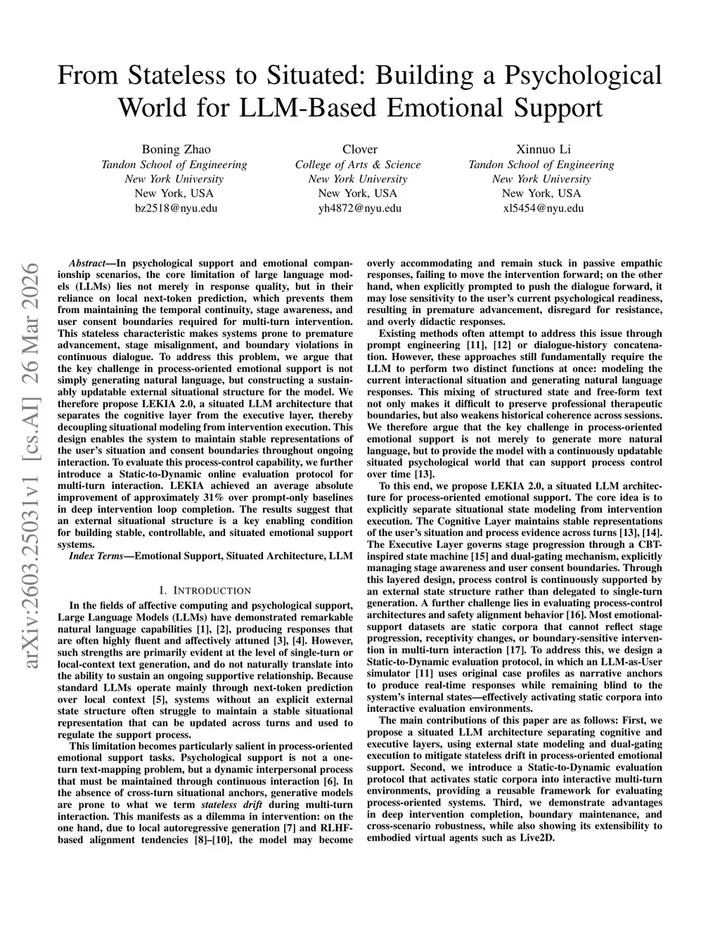 In psychological support and emotional companionship scenarios, the core limitation of large language models (LLMs) lies not merely in response quality, but in their reliance on local next-token prediction, which prevents them from maintaining the temporal continuity, stage awareness, and user consent boundaries required for multi-turn intervention. This stateless characteristic makes systems prone to premature advancement, stage misalignment, and boundary violations in continuous dialogue. To address this problem, we argue that the key challenge in process-oriented emotional support is not simply generating natural language, but constructing a sustainably updatable external situational structure for the model. We therefore propose LEKIA 2.0, a situated LLM architecture that separates the cognitive layer from the executive layer, thereby decoupling situational modeling from intervention execution. This design enables the system to maintain stable representations of the user's situation and consent boundaries throughout ongoing interaction. To evaluate this process-control capability, we further introduce a Static-to-Dynamic online evaluation protocol for multi-turn interaction. LEKIA achieved an average absolute improvement of approximately 31% over prompt-only baselines in deep intervention loop completion. The results suggest that an external situational structure is a key enabling condition for building stable, controllable, and situated emotional support systems.