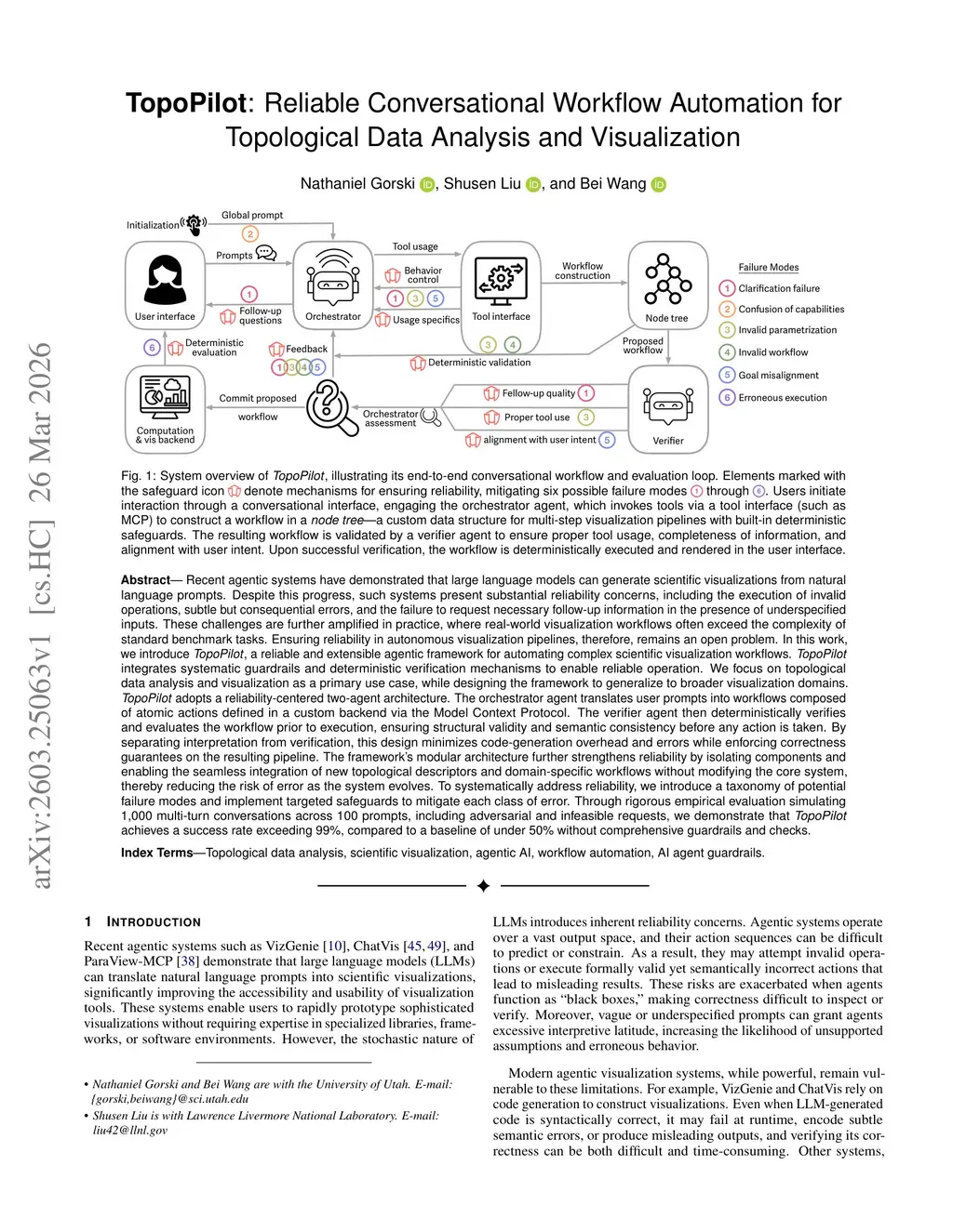 Recent agentic systems demonstrate that large language models can generate scientific visualizations from natural language. However, reliability remains a major limitation: systems may execute invalid operations, introduce subtle but consequential errors, or fail to request missing information when inputs are underspecified. These issues are amplified in real-world workflows, which often exceed the complexity of standard benchmarks. Ensuring reliability in autonomous visualization pipelines therefore remains an open challenge. We present TopoPilot, a reliable and extensible agentic framework for automating complex scientific visualization workflows. TopoPilot incorporates systematic guardrails and verification mechanisms to ensure reliable operation. While we focus on topological data analysis and visualization as a primary use case, the framework is designed to generalize across visualization domains. TopoPilot adopts a reliability-centered two-agent architecture. An orchestrator agent translates user prompts into workflows composed of atomic backend actions, while a verifier agent evaluates these workflows prior to execution, enforcing structural validity and semantic consistency. This separation of interpretation and verification reduces code-generation errors and enforces correctness guarantees. A modular architecture further improves robustness by isolating components and enabling seamless integration of new descriptors and domain-specific workflows without modifying the core system. To systematically address reliability, we introduce a taxonomy of failure modes and implement targeted safeguards for each class. In evaluations simulating 1,000 multi-turn conversations across 100 prompts, including adversarial and infeasible requests, TopoPilot achieves a success rate exceeding 99%, compared to under 50% for baselines without comprehensive guardrails and checks.