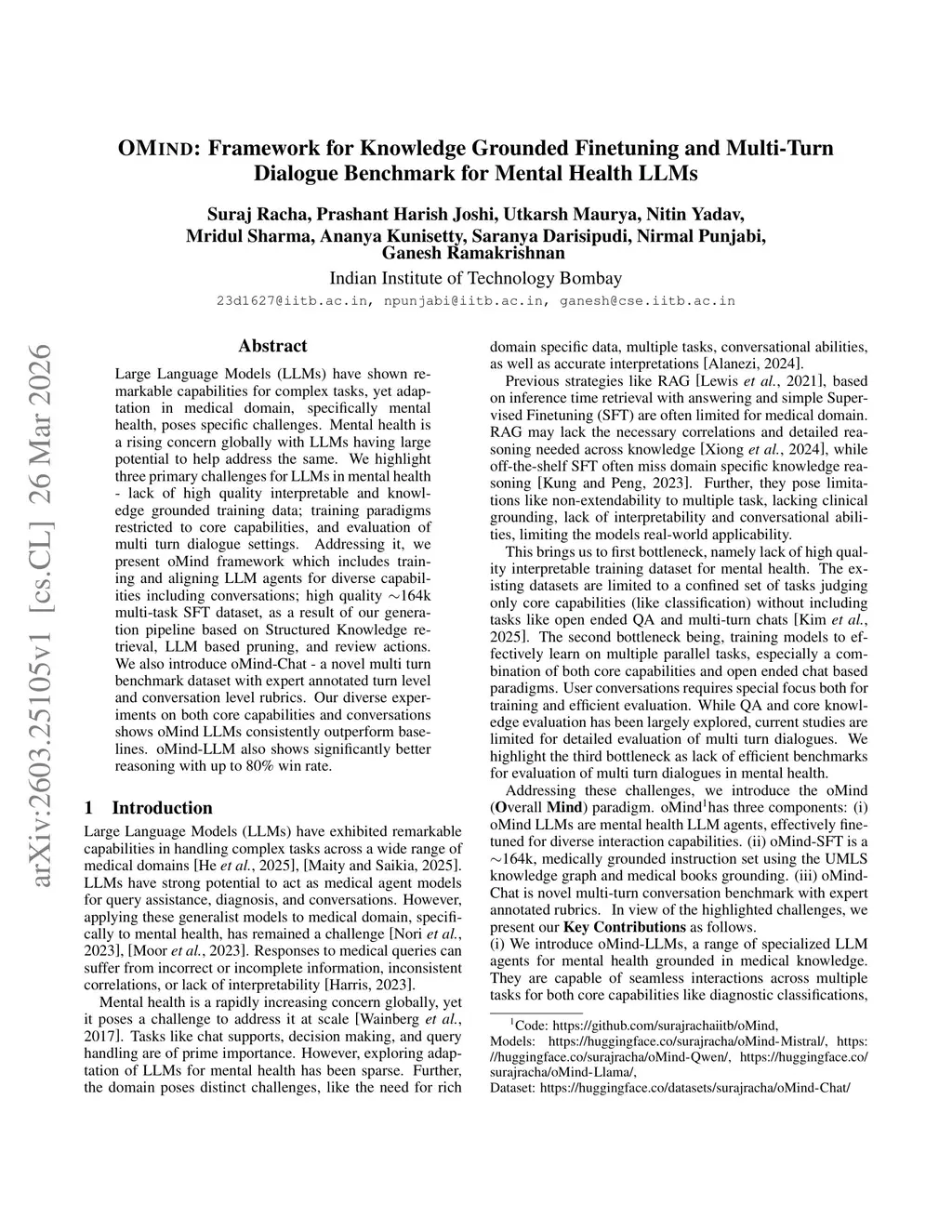 OMIND: Framework for Knowledge Grounded Finetuning and Multi-Turn Dialogue Benchmark for Mental Health LLMs