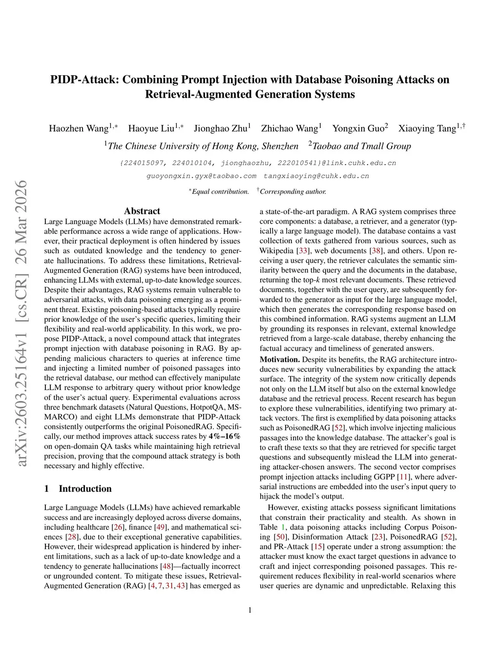 Large Language Models (LLMs) have demonstrated remarkable performance across a wide range of applications. However, their practical deployment is often hindered by issues such as outdated knowledge and the tendency to generate hallucinations. To address these limitations, Retrieval-Augmented Generation (RAG) systems have been introduced, enhancing LLMs with external, up-to-date knowledge sources. Despite their advantages, RAG systems remain vulnerable to adversarial attacks, with data poisoning emerging as a prominent threat. Existing poisoning-based attacks typically require prior knowledge of the user's specific queries, limiting their flexibility and real-world applicability. In this work, we propose PIDP-Attack, a novel compound attack that integrates prompt injection with database poisoning in RAG. By appending malicious characters to queries at inference time and injecting a limited number of poisoned passages into the retrieval database, our method can effectively manipulate LLM response to arbitrary query without prior knowledge of the user's actual query. Experimental evaluations across three benchmark datasets (Natural Questions, HotpotQA, MS-MARCO) and eight LLMs demonstrate that PIDP-Attack consistently outperforms the original PoisonedRAG. Specifically, our method improves attack success rates by 4% to 16% on open-domain QA tasks while maintaining high retrieval precision, proving that the compound attack strategy is both necessary and highly effective.