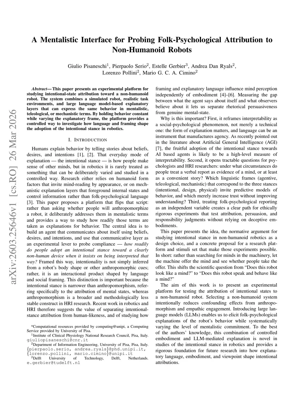 This paper presents an experimental platform for studying intentional-state attribution toward a non-humanoid robot. The system combines a simulated robot, realistic task environments, and large language model-based explanatory layers that can express the same behavior in mentalistic, teleological, or mechanistic terms. By holding behavior constant while varying the explanatory frame, the platform provides a controlled way to investigate how language and framing shape the adoption of the intentional stance in robotics.