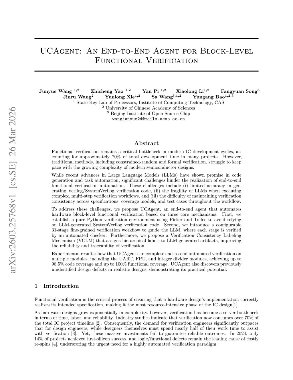 Functional verification remains a critical bottleneck in modern IC development cycles, accounting for approximately 70% of total development time in many projects. However, traditional methods, including constrained-random and formal verification, struggle to keep pace with the growing complexity of modern semiconductor designs.While recent advances in Large Language Models (LLMs) have shown promise in code generation and task automation, significant challenges hinder the realization of end-to-end functional verification automation. These challenges include (i) limited accuracy in generating Verilog/SystemVerilog verification code, (ii) the fragility of LLMs when executing complex, multi-step verification workflows, and (iii) the difficulty of maintaining verification consistency across specifications, coverage models, and test cases throughout the workflow.To address these challenges, we propose UCAgent, an end-to-end agent that automates hardware block-level functional verification based on three core mechanisms. First, we establish a pure Python verification environment using Picker and Toffee to avoid relying on LLM-generated SystemVerilog verification code. Second, we introduce a configurable 31-stage fine-grained verification workflow to guide the LLM, where each stage is verified by an automated checker. Furthermore, we propose a Verification Consistency Labeling Mechanism (VCLM) that assigns hierarchical labels to LLM-generated artifacts, improving the reliability and traceability of verification.Experimental results show that UCAgent can complete end-to-end automated verification on multiple modules, including the UART, FPU, and integer divider modules, achieving up to 98.5% code coverage and up to 100% functional coverage. UCAgent also discovers previously unidentified design defects in realistic designs, demonstrating its practical potential.