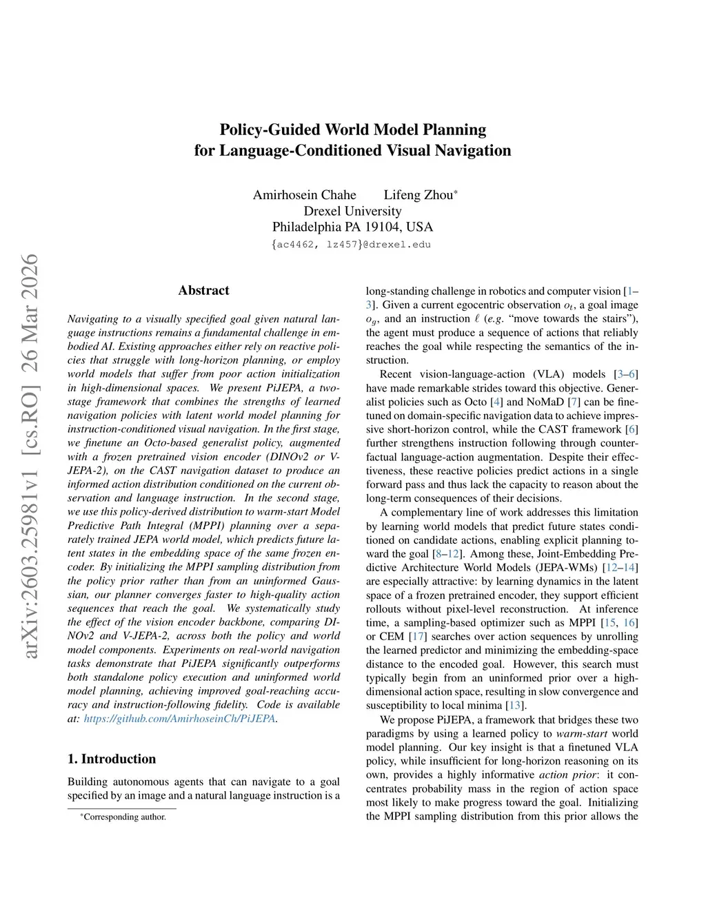 Navigating to a visually specified goal given natural language instructions remains a fundamental challenge in embodied AI. Existing approaches either rely on reactive policies that struggle with long-horizon planning, or employ world models that suffer from poor action initialization in high-dimensional spaces. We present PiJEPA, a two-stage framework that combines the strengths of learned navigation policies with latent world model planning for instruction-conditioned visual navigation. In the first stage, we finetune an Octo-based generalist policy, augmented with a frozen pretrained vision encoder (DINOv2 or V-JEPA-2), on the CAST navigation dataset to produce an informed action distribution conditioned on the current observation and language instruction. In the second stage, we use this policy-derived distribution to warm-start Model Predictive Path Integral (MPPI) planning over a separately trained JEPA world model, which predicts future latent states in the embedding space of the same frozen encoder. By initializing the MPPI sampling distribution from the policy prior rather than from an uninformed Gaussian, our planner converges faster to high-quality action sequences that reach the goal. We systematically study the effect of the vision encoder backbone, comparing DINOv2 and V-JEPA-2, across both the policy and world model components. Experiments on real-world navigation tasks demonstrate that PiJEPA significantly outperforms both standalone policy execution and uninformed world model planning, achieving improved goal-reaching accuracy and instruction-following fidelity.