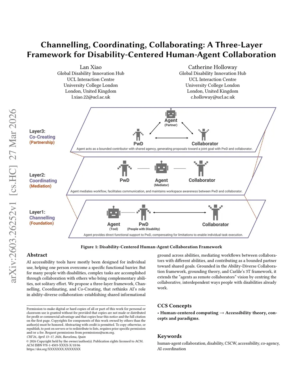 Channelling, Coordinating, Collaborating: A Three-Layer Framework for Disability-Centered Human-Agent Collaboration