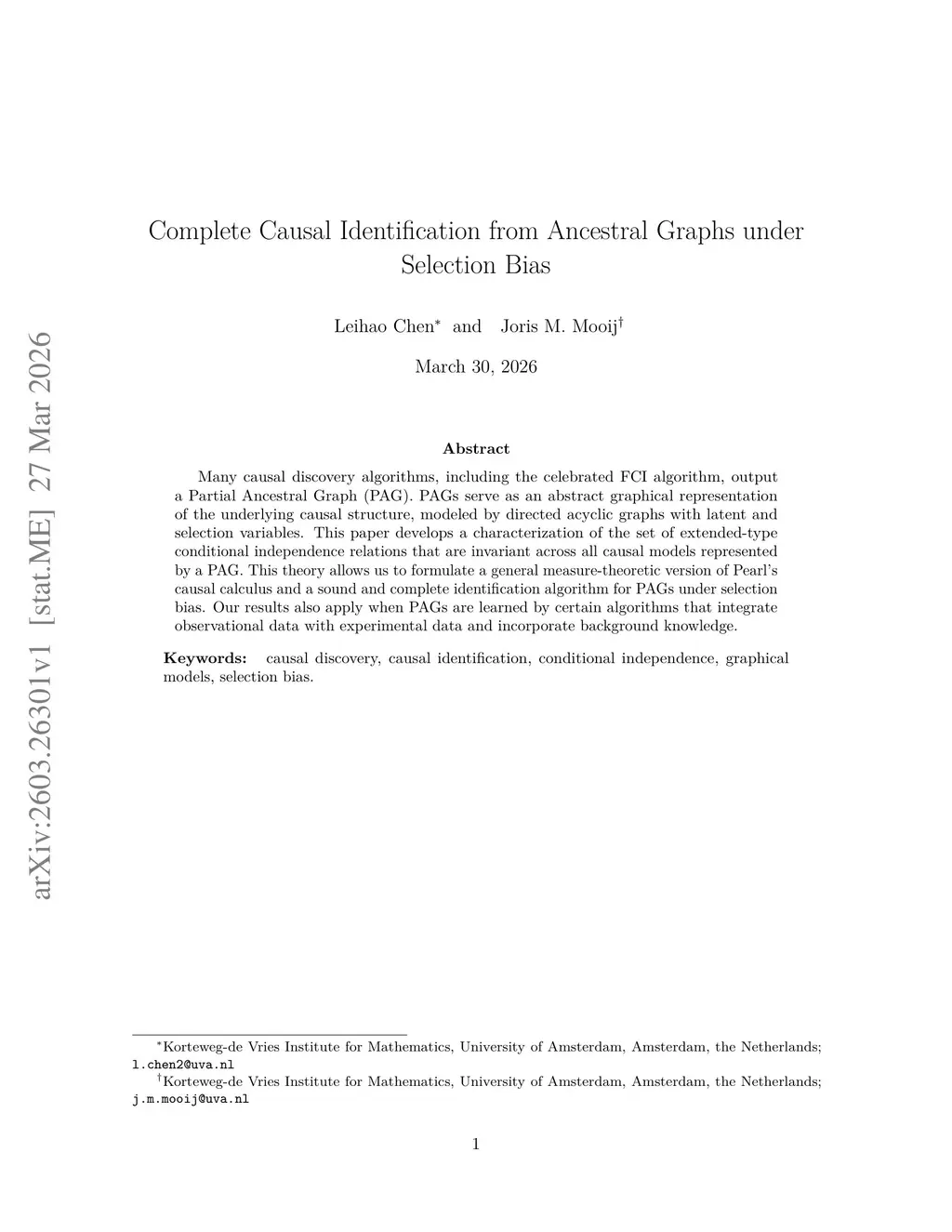 Many causal discovery algorithms, including the celebrated FCI algorithm, output a Partial Ancestral Graph (PAG). PAGs serve as an abstract graphical representation of the underlying causal structure, modeled by directed acyclic graphs with latent and selection variables. This paper develops a characterization of the set of extended-type conditional independence relations that are invariant across all causal models represented by a PAG. This theory allows us to formulate a general measure-theoretic version of Pearl's causal calculus and a sound and complete identification algorithm for PAGs under selection bias. Our results also apply when PAGs are learned by certain algorithms that integrate observational data with experimental data and incorporate background knowledge.