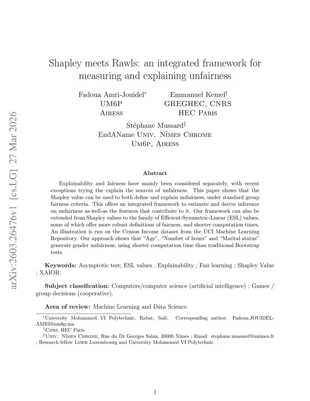 Explainability and fairness have mainly been considered separately, with recent exceptions trying the explain the sources of unfairness. This paper shows that the Shapley value can be used to both define and explain unfairness, under standard group fairness criteria. This offers an integrated framework to estimate and derive inference on unfairness as-well-as the features that contribute to it. Our framework can also be extended from Shapley values to the family of Efficient-Symmetric-Linear (ESL) values, some of which offer more robust definitions of fairness, and shorter computation times. An illustration is run on the Census Income dataset from the UCI Machine Learning Repository. Our approach shows that ``Age", ``Number of hours" and ``Marital status" generate gender unfairness, using shorter computation time than traditional Bootstrap tests.